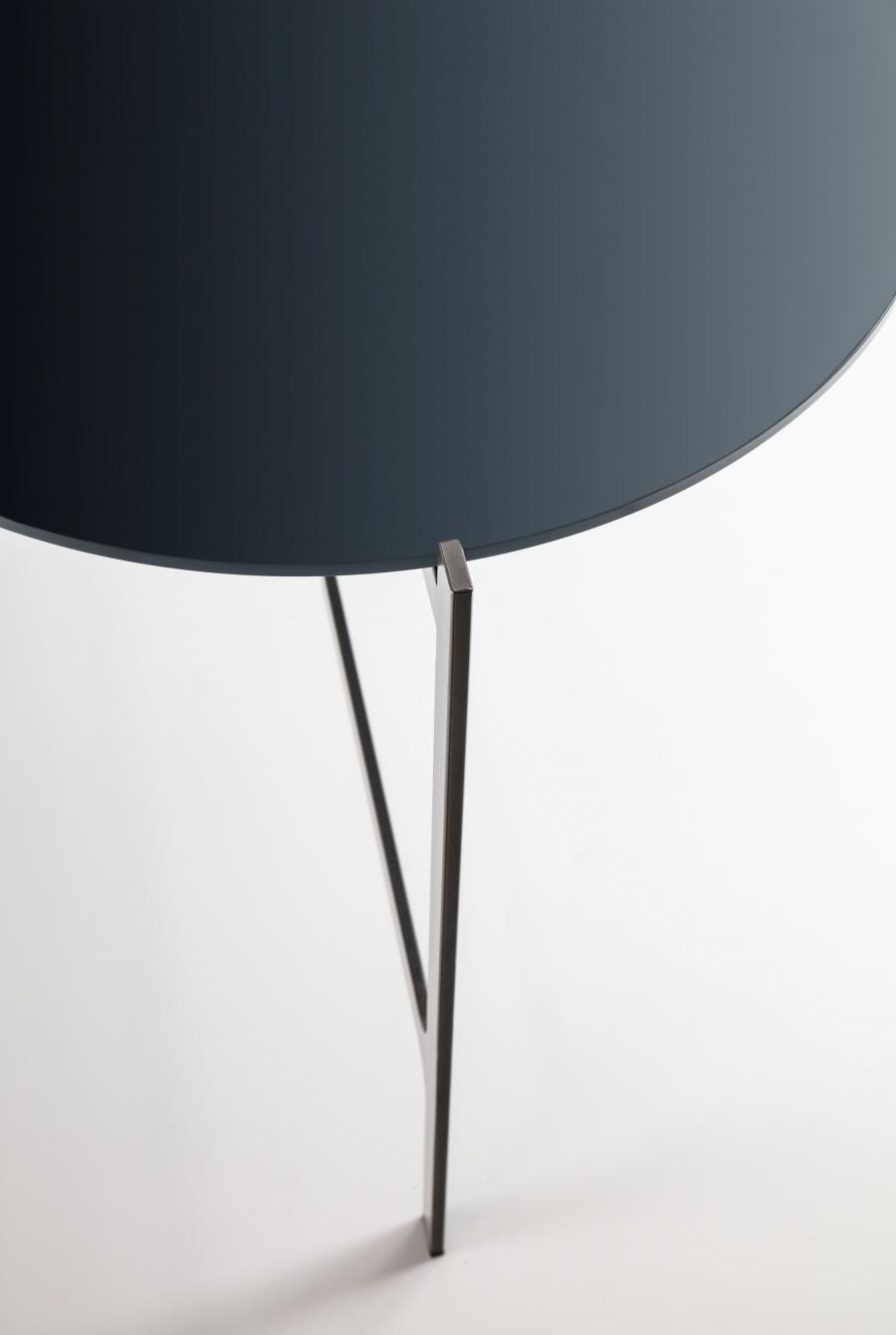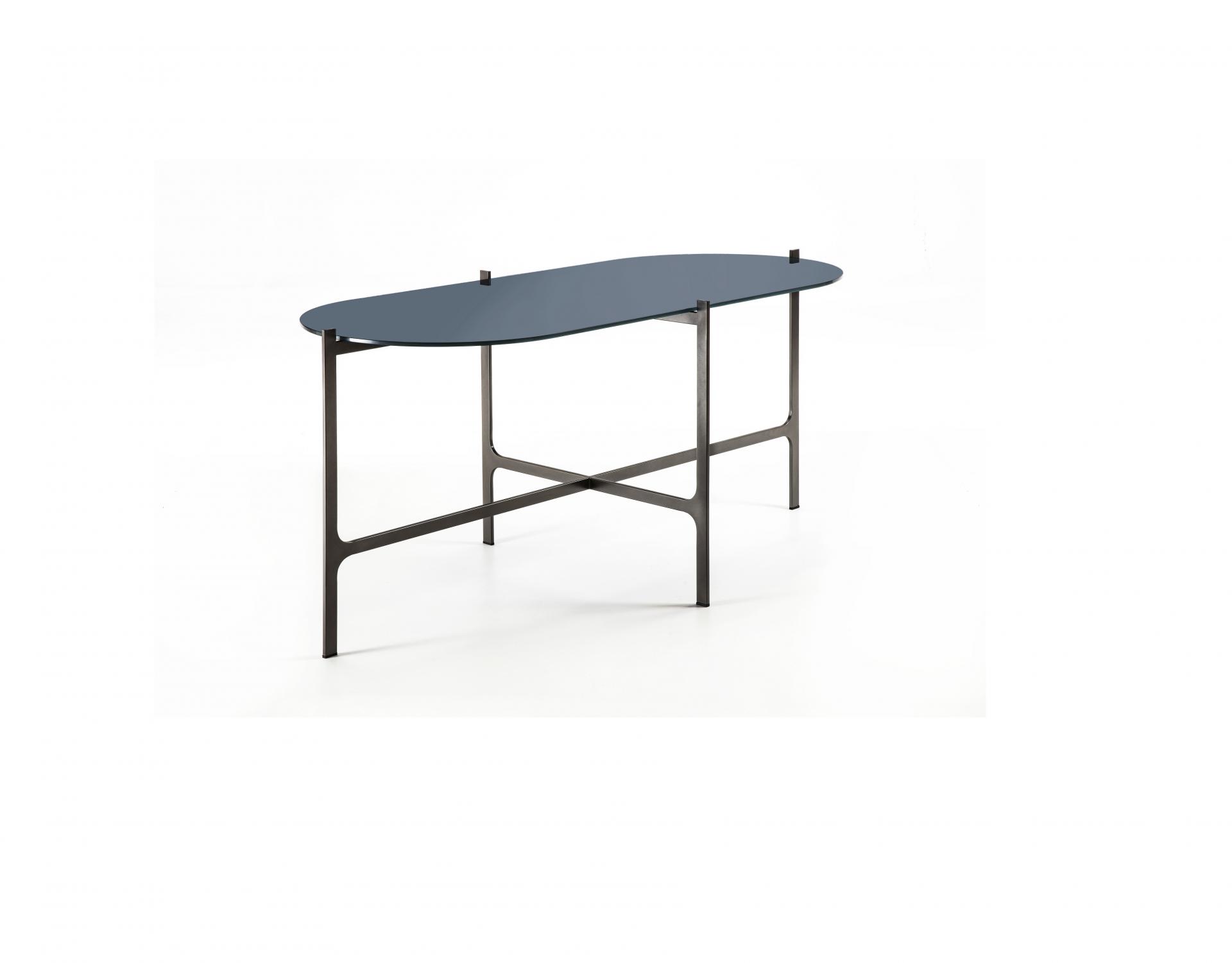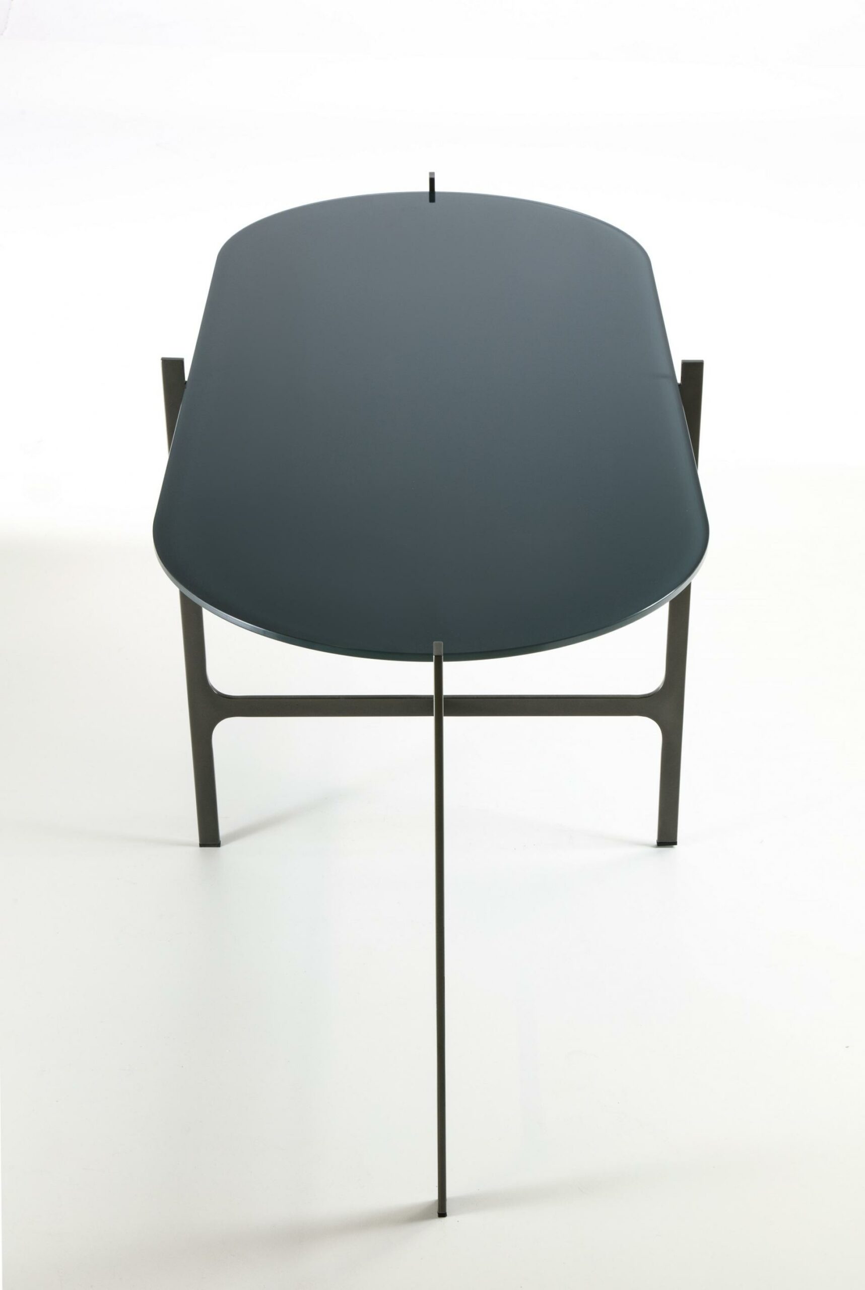 Стол с окрашенной трубчатой конструкцией прямоугольного сечения. Столешница может быть изготовлена из различных материалов: мрамора (толщиной 20 мм), кожи (толщиной 25 мм) или стекла.