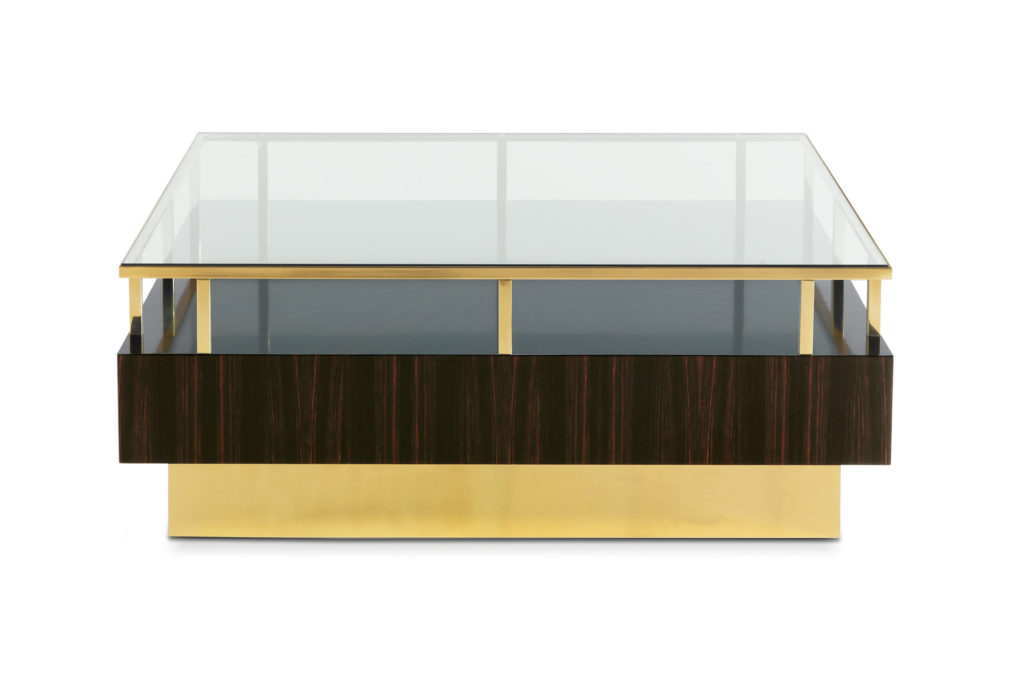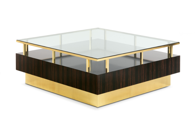 Элегантный журнальный столик из черного дерева и латуни со стеклянной столешницей. Его приятный дизайн является результатом тщательного исследования, которое привело к гармоничному союзу между настоящим и прошлым, традициями и инновациями.