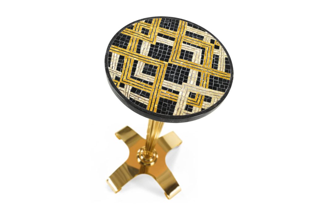 Боковой столик в современном стиле с латунным основанием и столешницей ручной работы с микро-мозаикой из мрамора Nero Marquina и золотыми плитками двух оттенков. Столешница, украшенная вручную, вставлена в мраморную основу Pierre Bleu