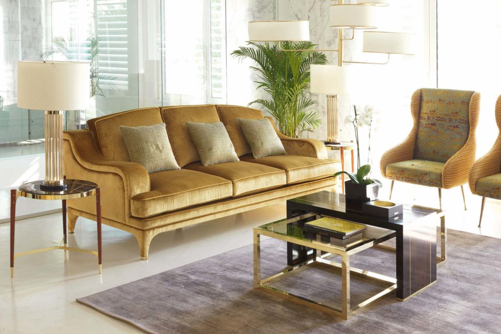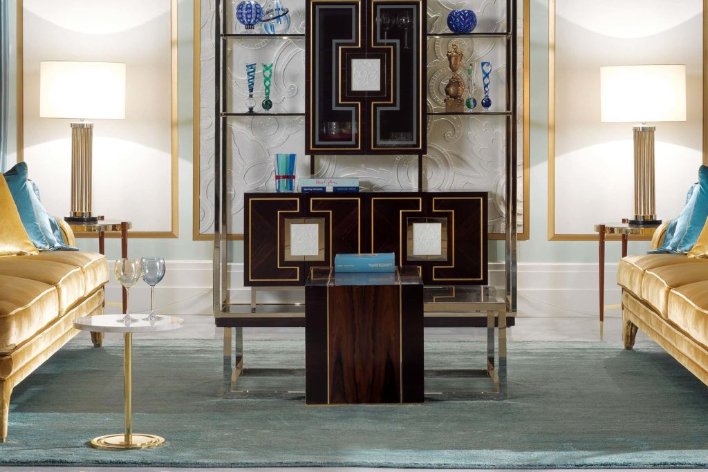 Сочетание журнальных столиков, в том числе один из латуни с бронзовой стеклянной столешницей, преодолеваемой вторым, более высоким, из черного дерева, Зирикота и латуни.