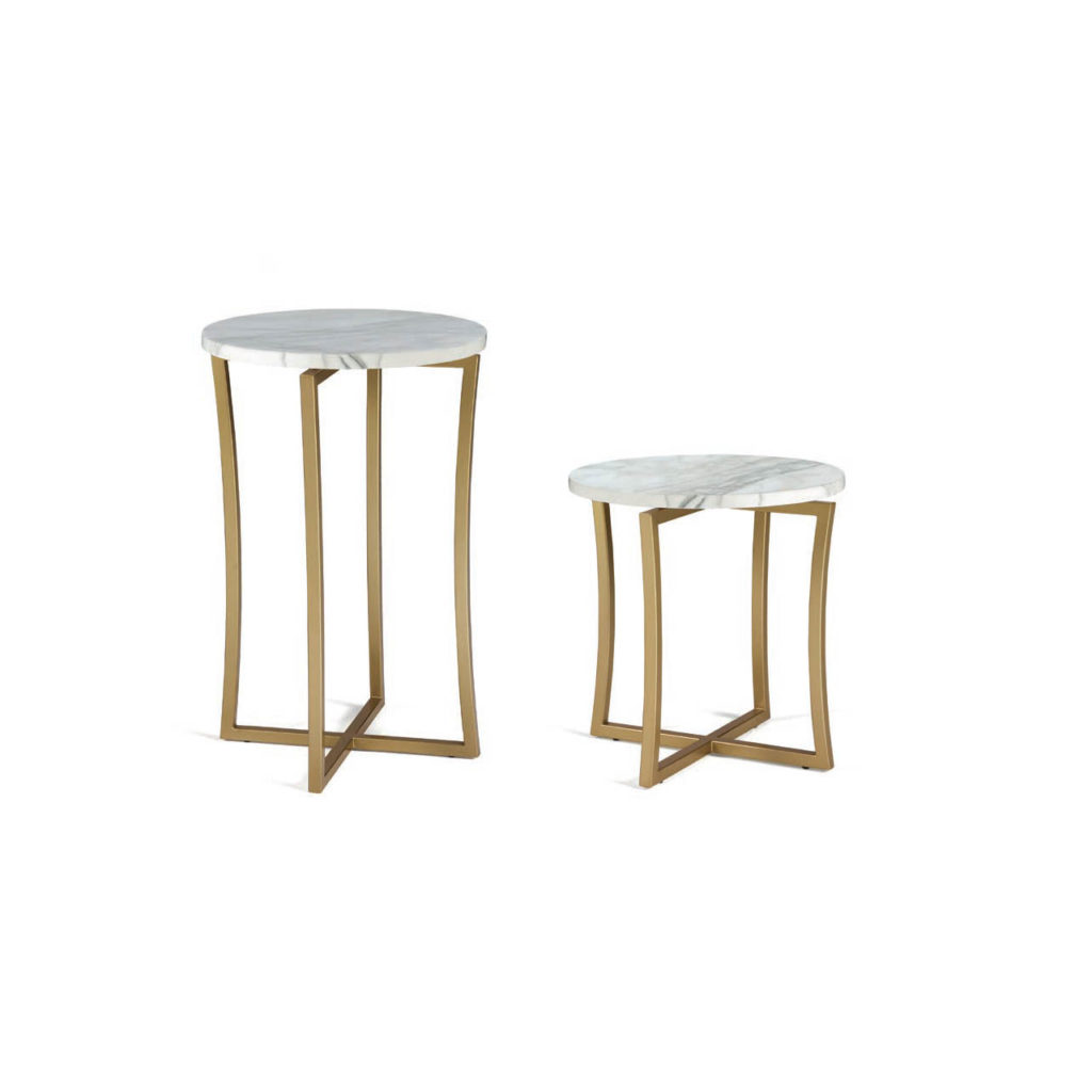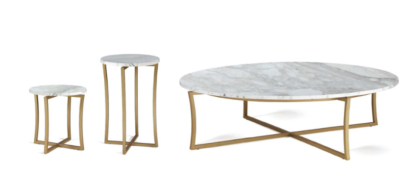 Изысканный набор журнальных столиков из матовой латуни с мраморным верхом круглой формы.