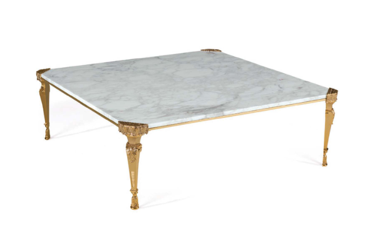 Элегантный мраморный центральный журнальный столик в классическом стиле с латунным основанием, смоченным золотом.