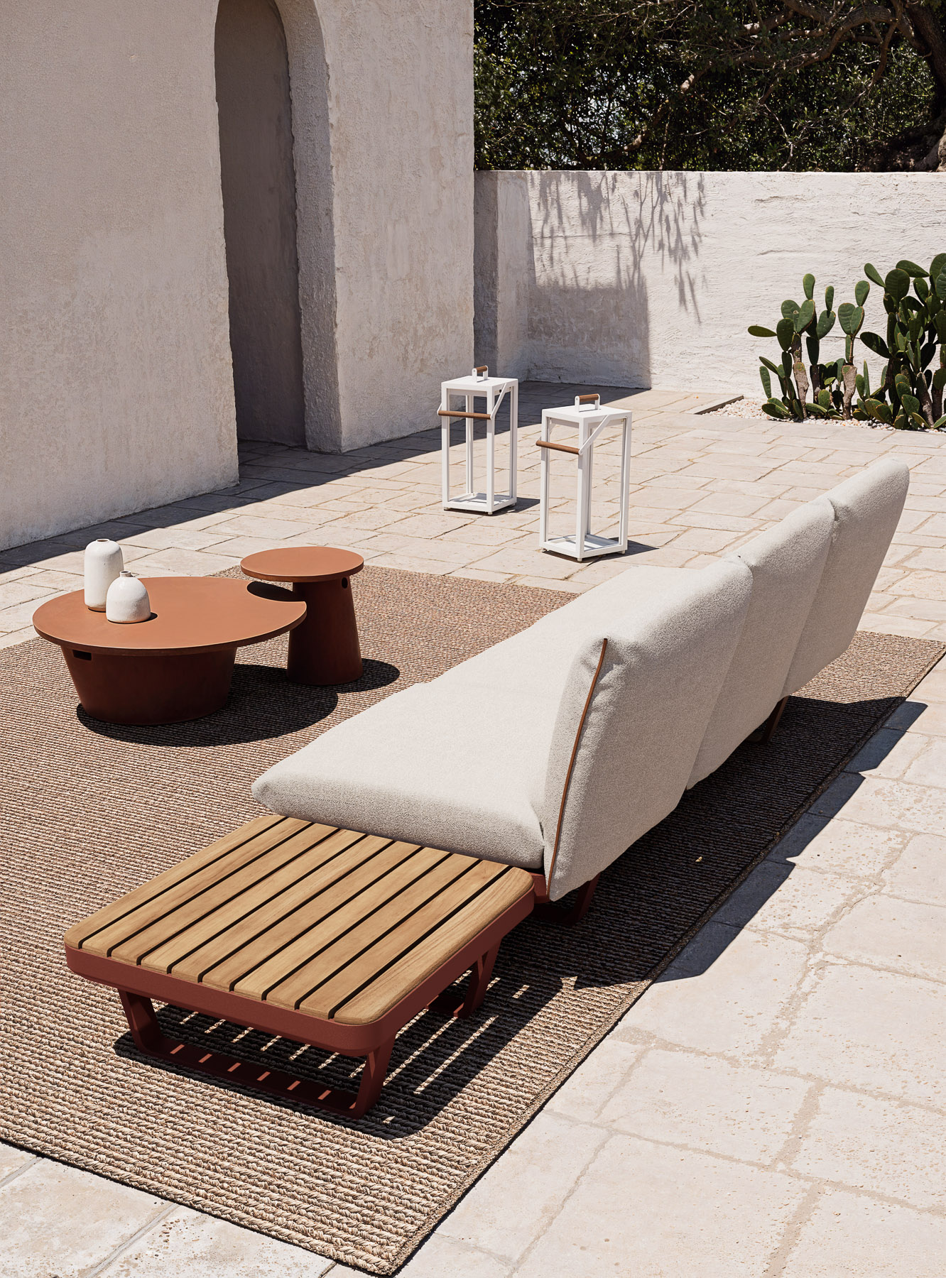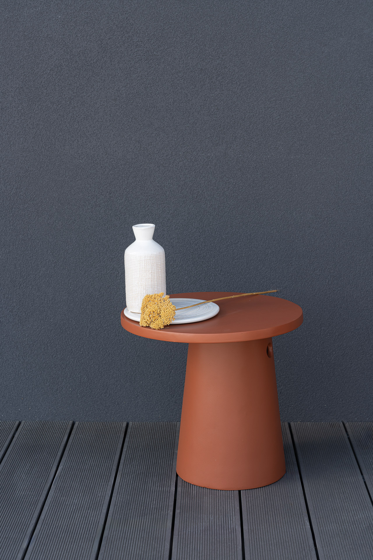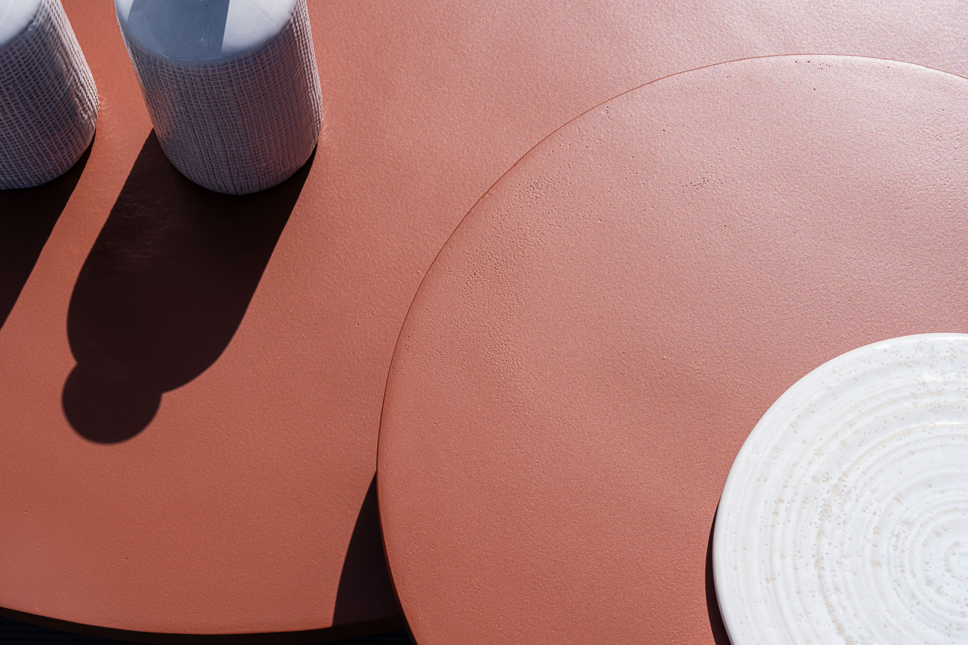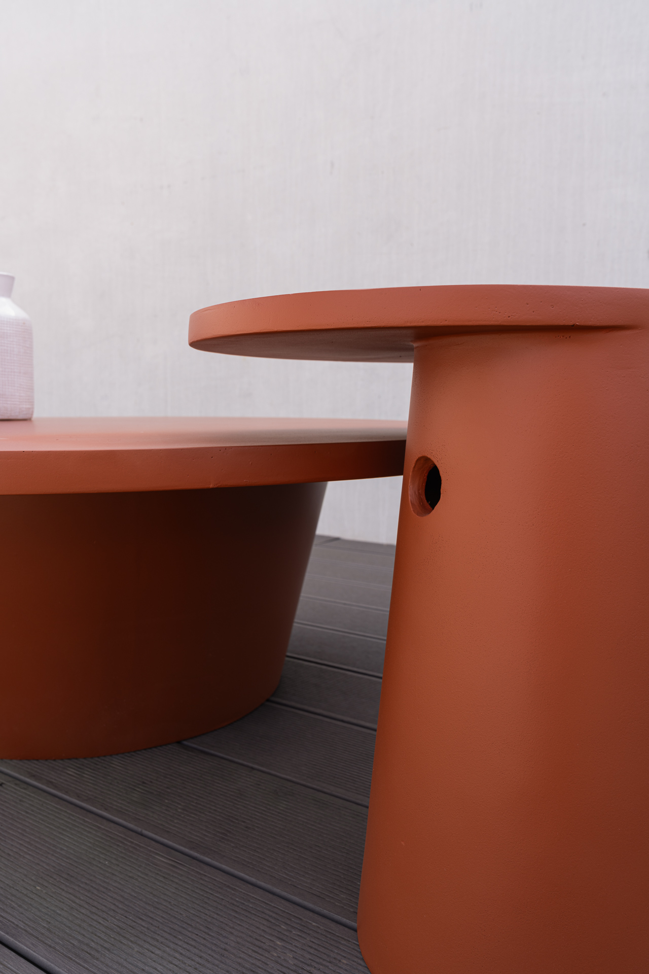 Столы-тотемы имеют асимметричное цилиндрическое основание и опорную поверхность. Отделка — бетон, цвет — сиена.