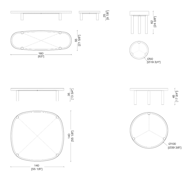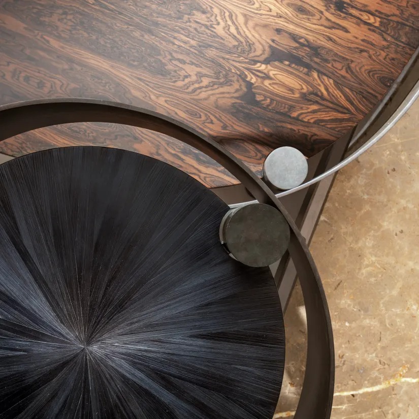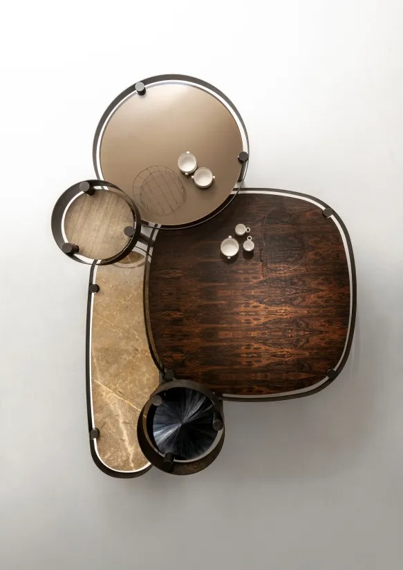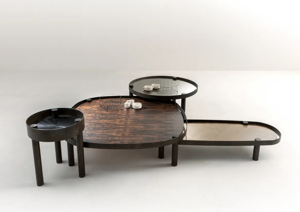 Семейство кофейных столиков с трубчатой основой из матированного металла с эффектом «подноса», доступных в различных формах, дизайнах и размерах, а также персонализируемых в отделках.