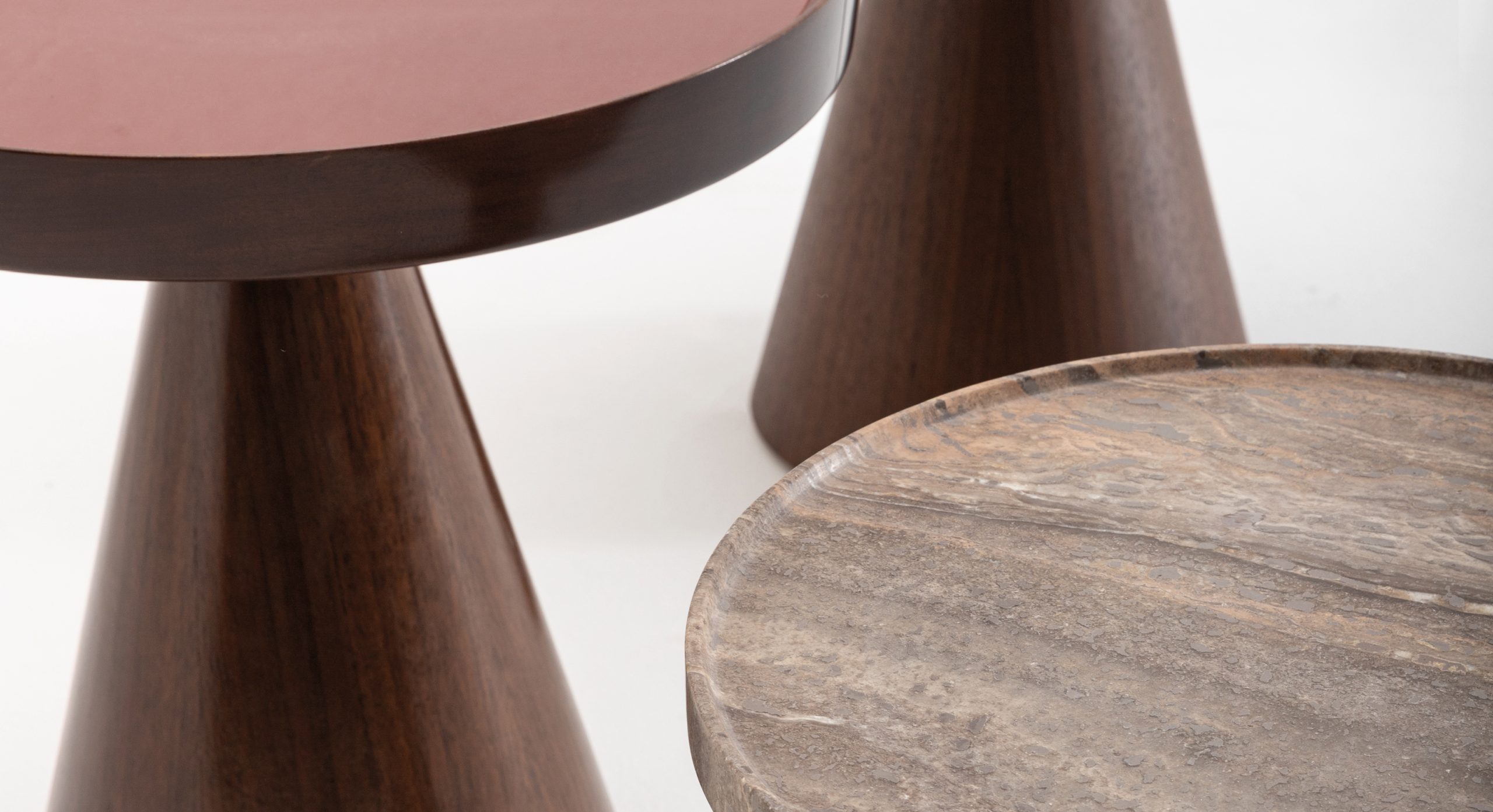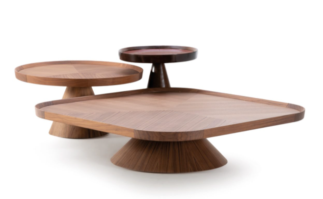 Конусообразная конструкция, облицованная шпоном различных пород дерева из ассортимента Ulivi Salotti. Рама из массива американского ореха с мраморной столешницей категорий A, B, деревом с различной отделкой или стеклом , окрашенным в наши эксклюзивные цвета.