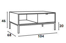 Конструкция из ДСП, дверные панели и ящики из МДФ, отделка меламином; металлические ножки с черным лаком. Размеры 104x68x46 см