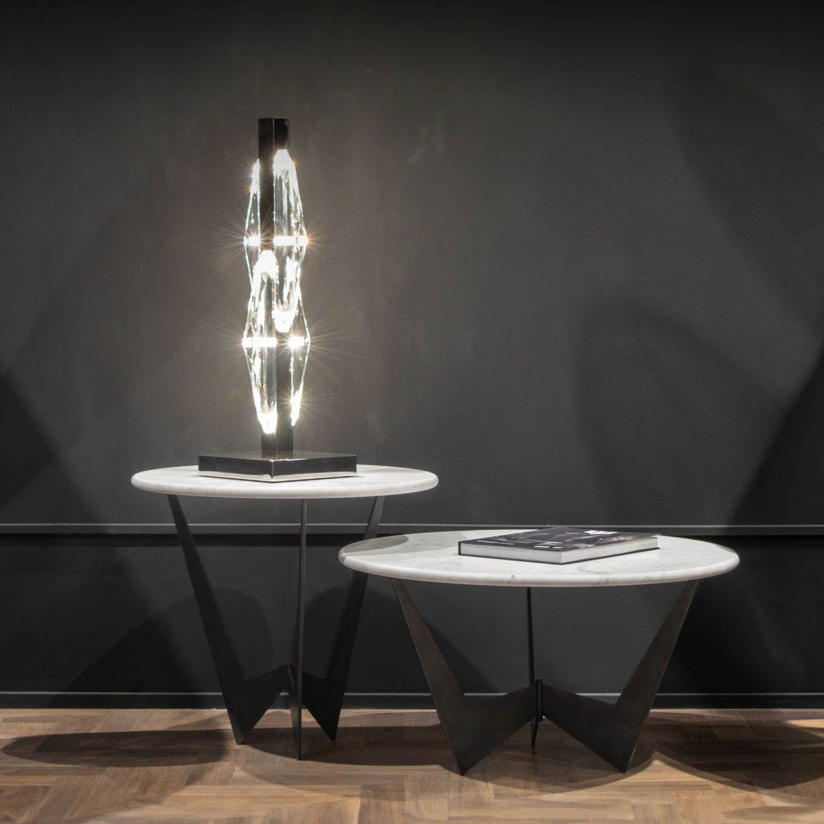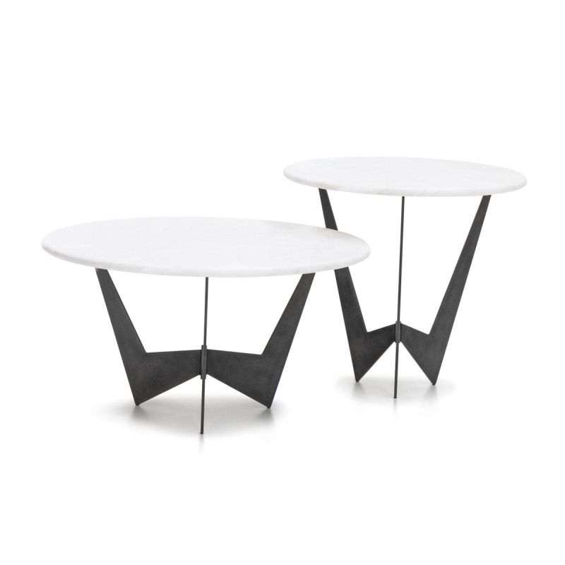 Высота приставного столика, см в диаметре. 55x55h: Столешница из кремово-матового мрамора Calacatta, металлическое основание из стали Delabrè. Низкий приставной столик, см в диаметре. 70x38h: Столешница из кремово-матового мрамора Calacatta, металлическое основание из стали Delabrè.