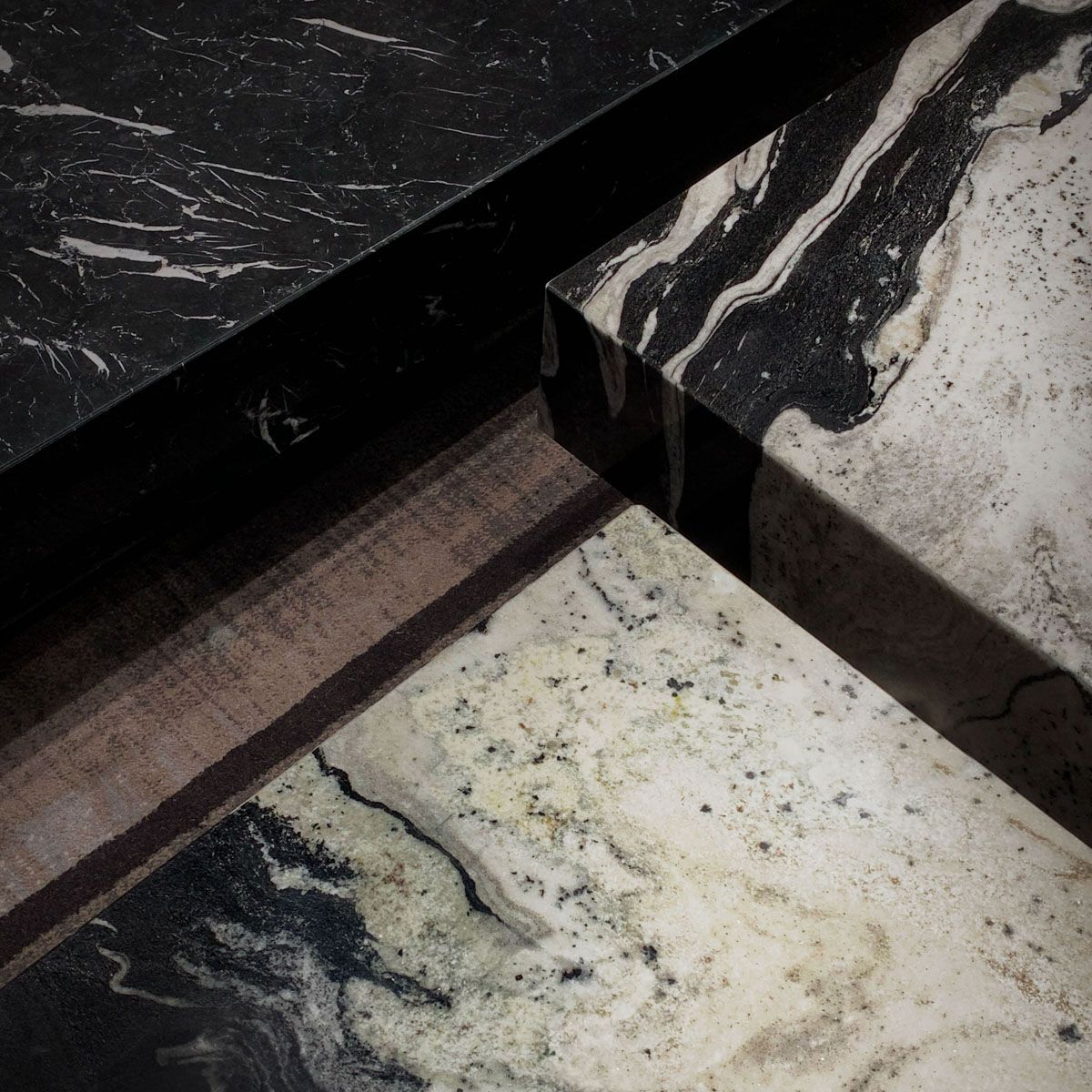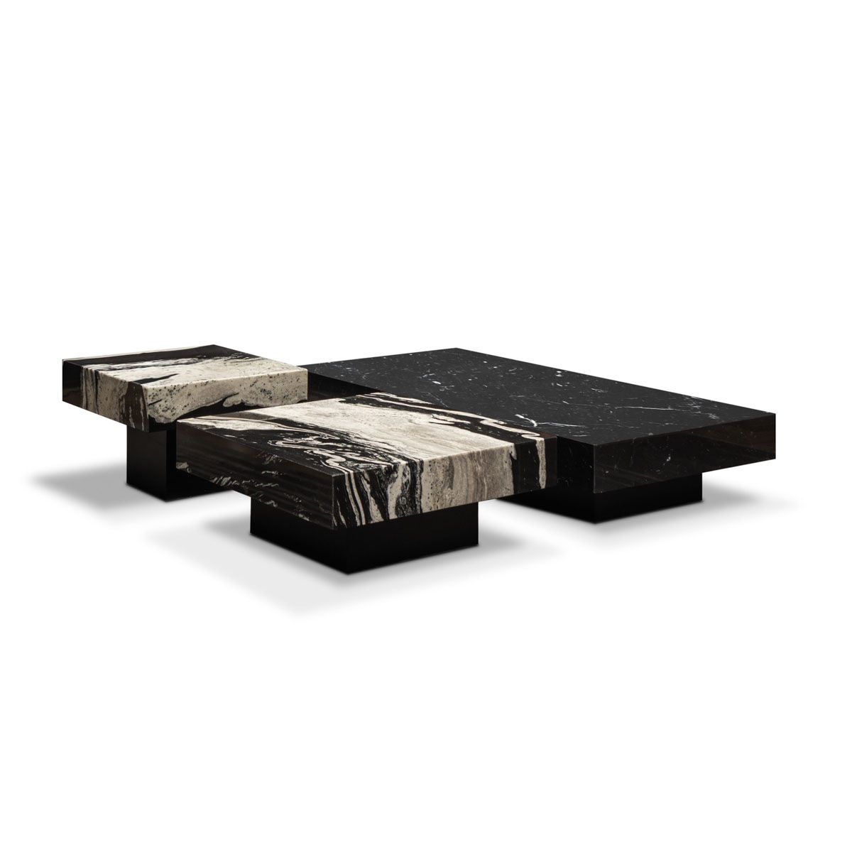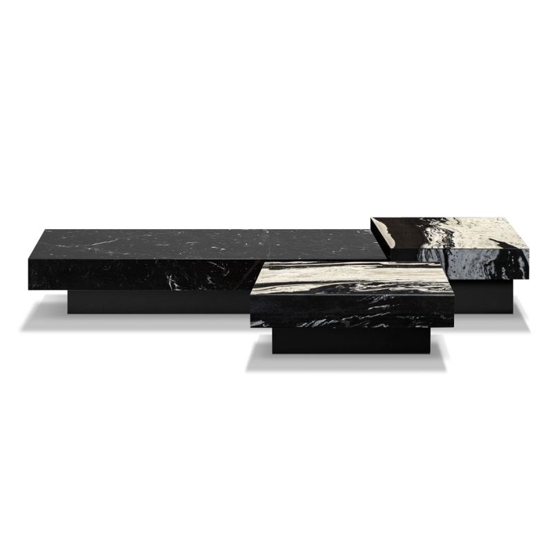Журнальный столик WE-159/S, 60x60x40 см в высоту. Журнальный столик WE-159/Q, 80x80x32 см в высоту. Журнальный столик WE-159/L, 160x80x28 см, из разных видов мрамора, основание покрыто лаком. Черная матовая отделка.