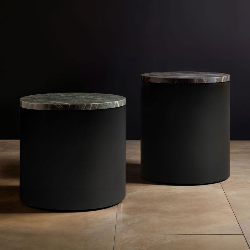 Приставной столик WE-161/H, диаметр см. 46x52h. Низкий приставной столик WE-161/L, диаметр см. 46x37h. Полностью покрыт лаком. Черный, столешница из мрамора.