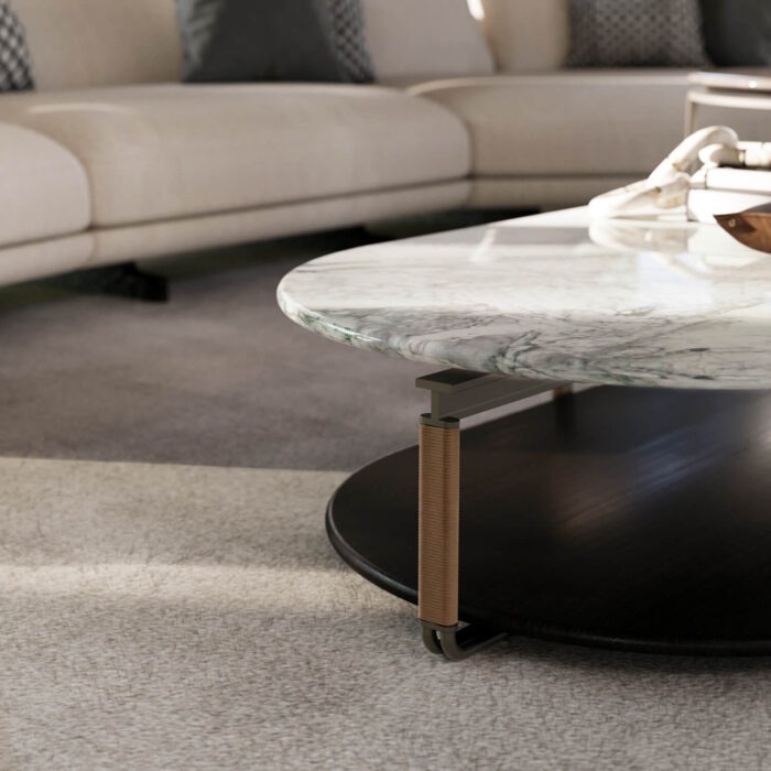 Доступны в различных размерах. Журнальный столик с мраморной столешницей, лакированной деревянной рамой и кожаными деталями.