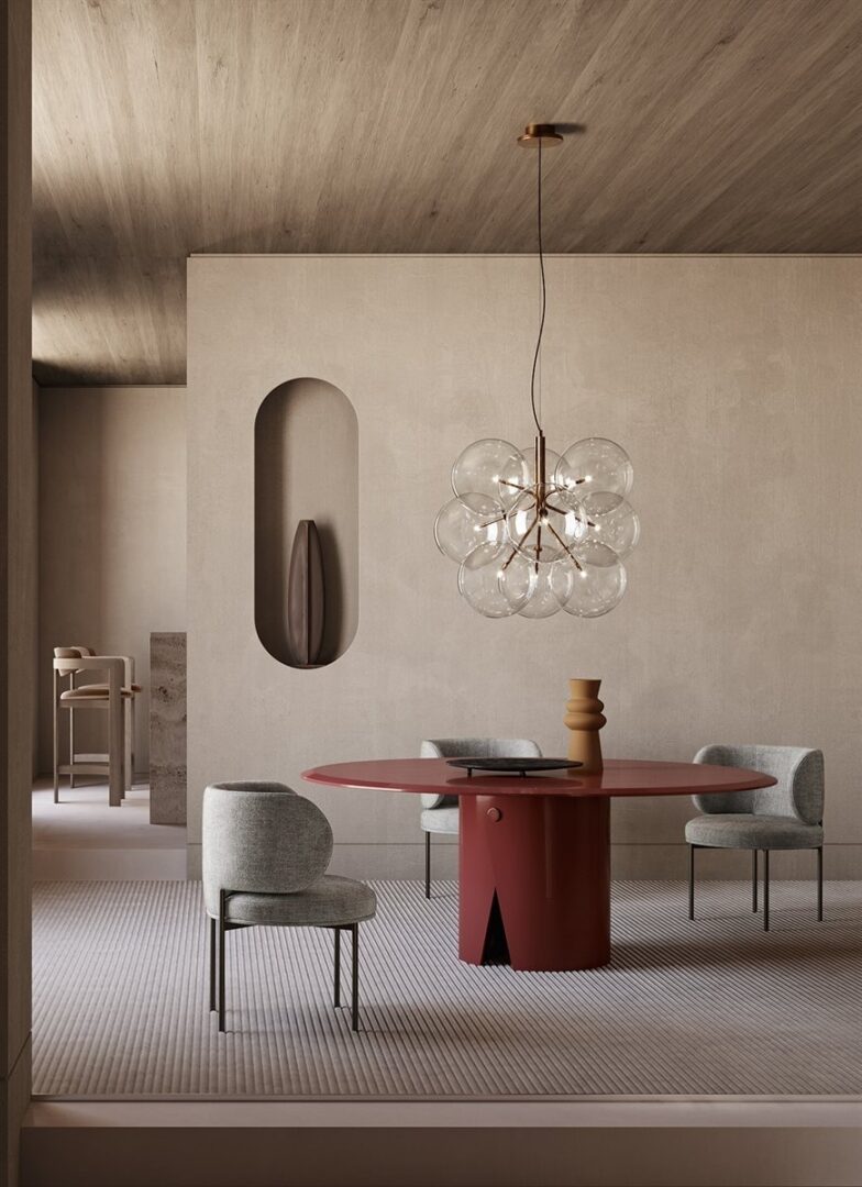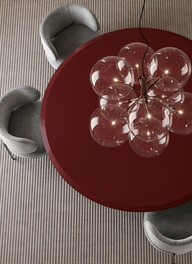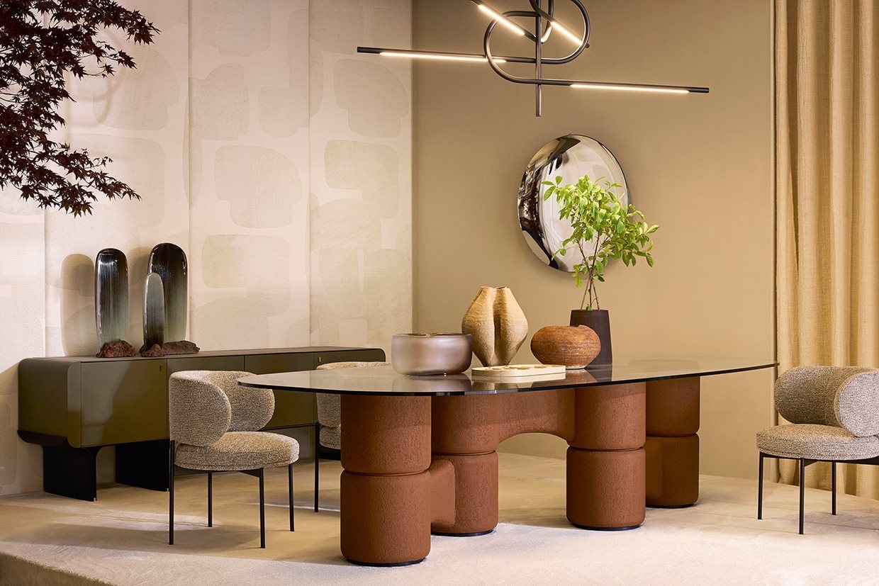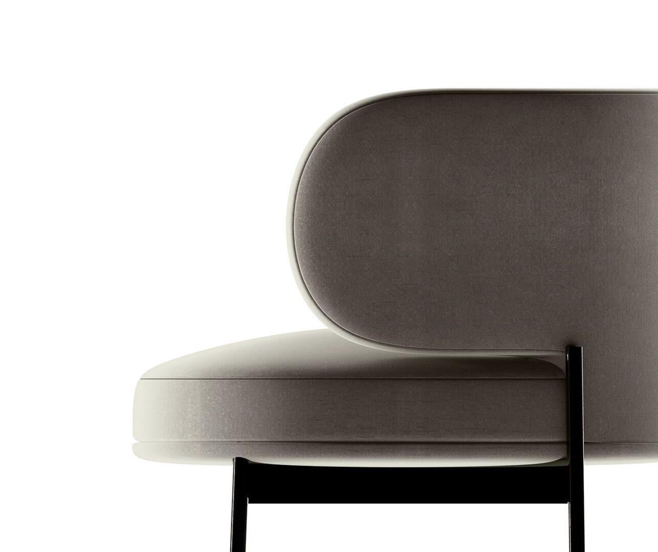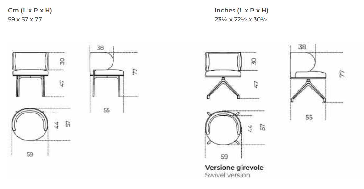 Стул с внутренней структурой из дерева, обитый недеформируемым пенополиуретаном различной плотности и полиэфирным волокном. Металлическая подставка окрашена в цвет «теплый серый». Обивка из ткани или кожи в цветах образца. Доступна версия с поворотным движением на 180° С возвратом с 4-спицевой подставкой из металла, окрашенного в цвет «теплый серый» с концами.