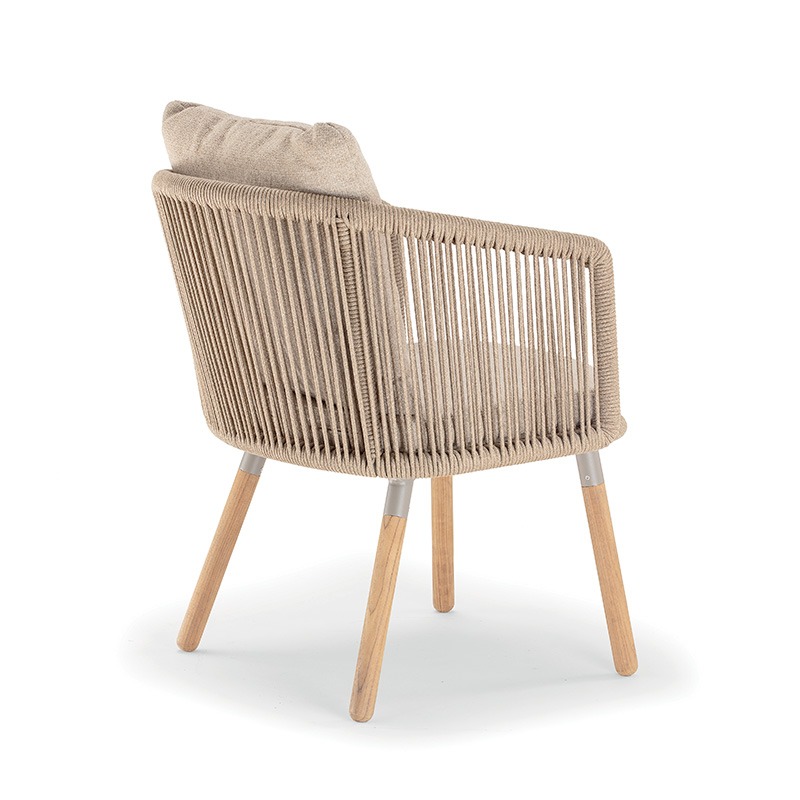 Алюминиевый стул, обтянутый полиэстеровым канатом, с ножками из тикового дерева. Подушка обита акриловой тканью. Продается по 2 штуки в каждой коробке.