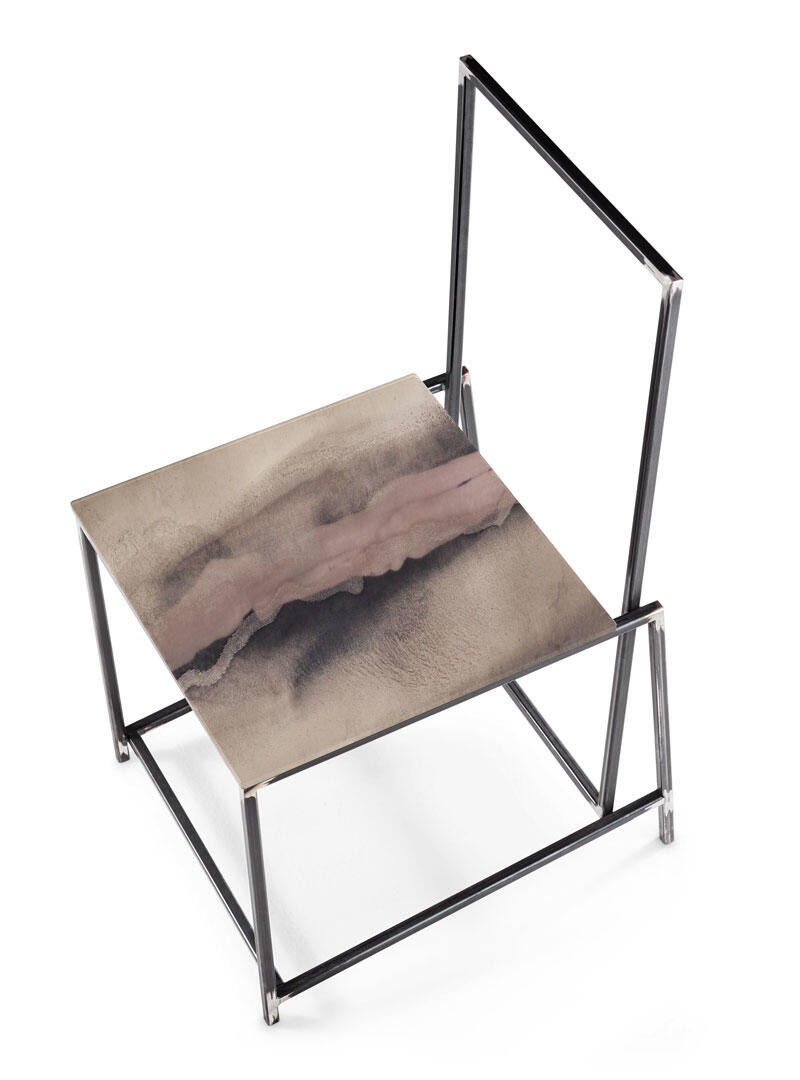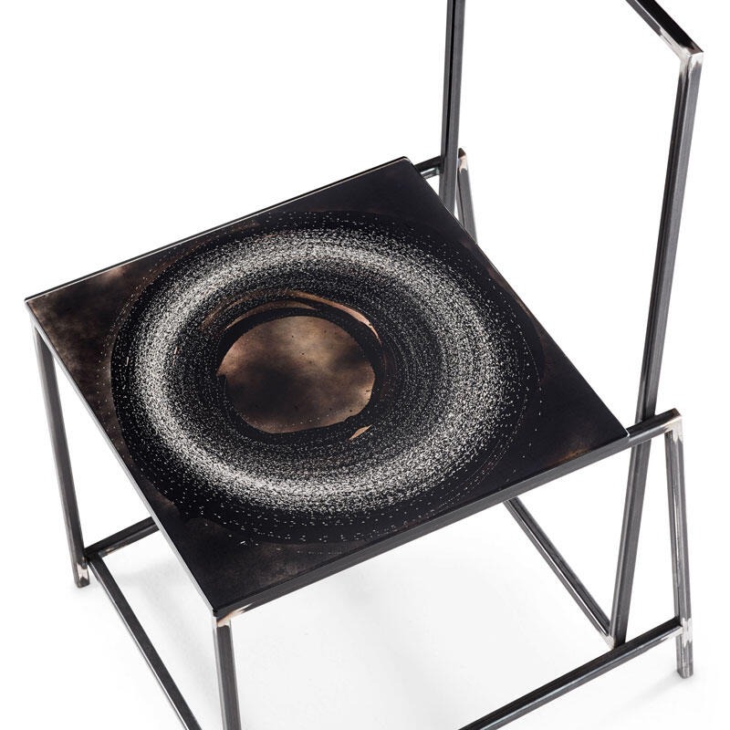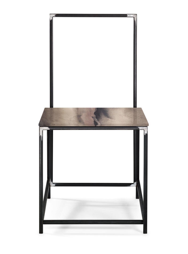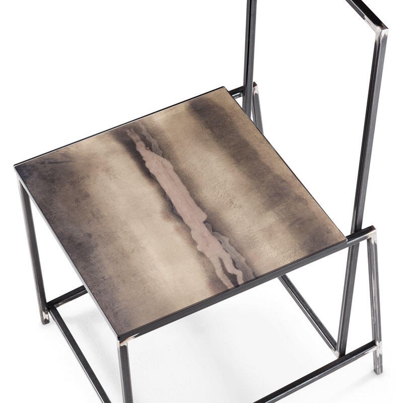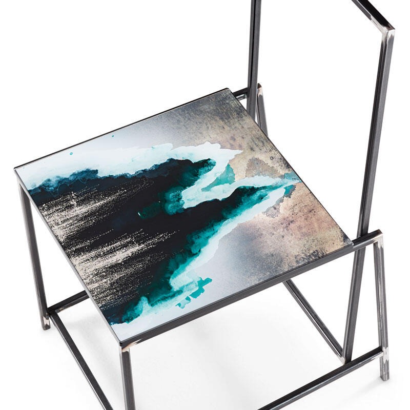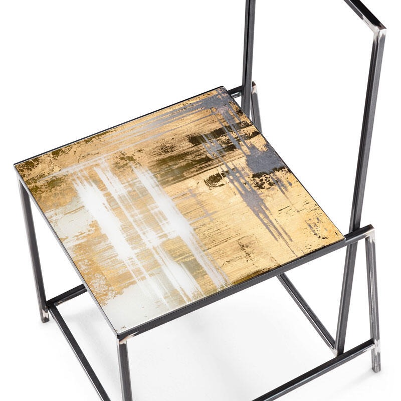 Металлическая конструкция прямоугольной формы с никелевым покрытием. Стеклянное сиденье может быть украшено любым декором ручной работы «Paesaggi Italiani».