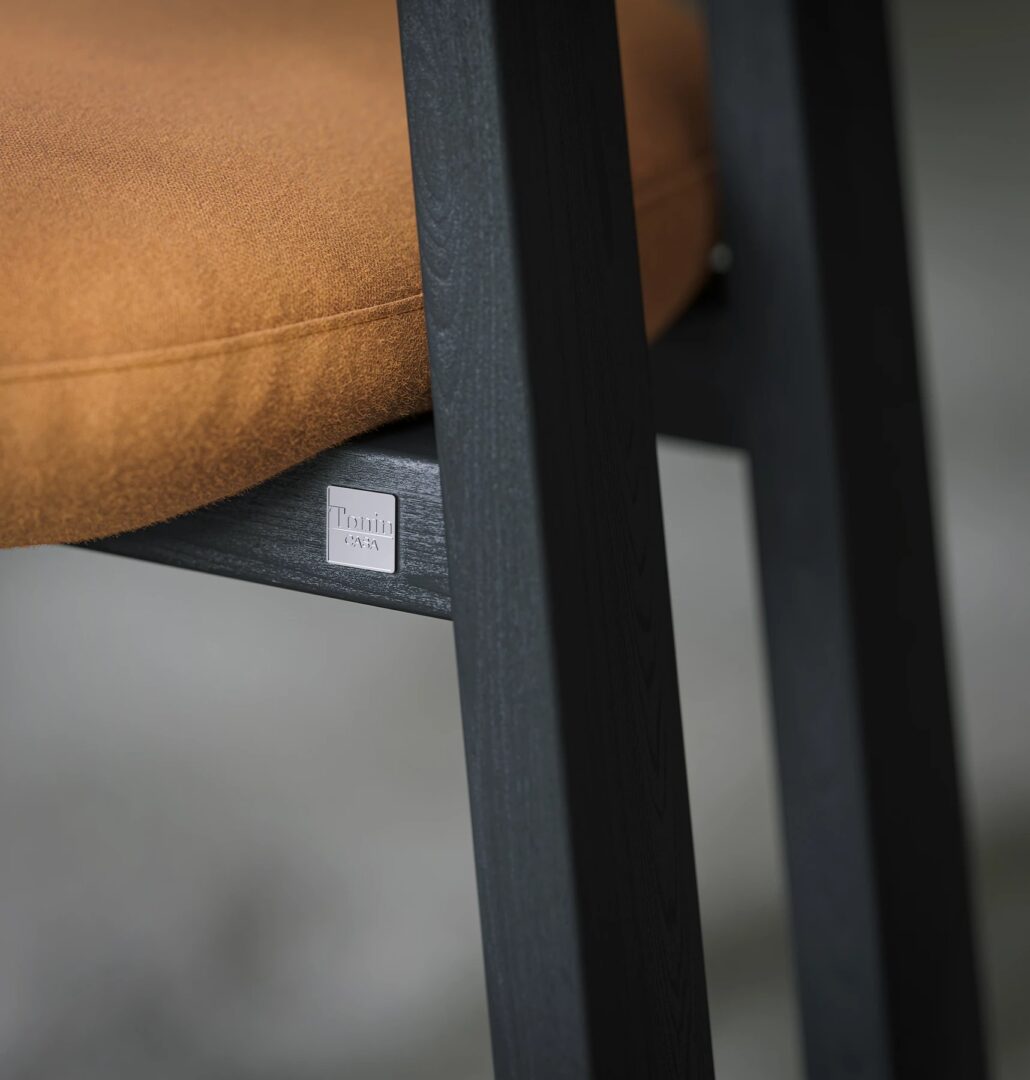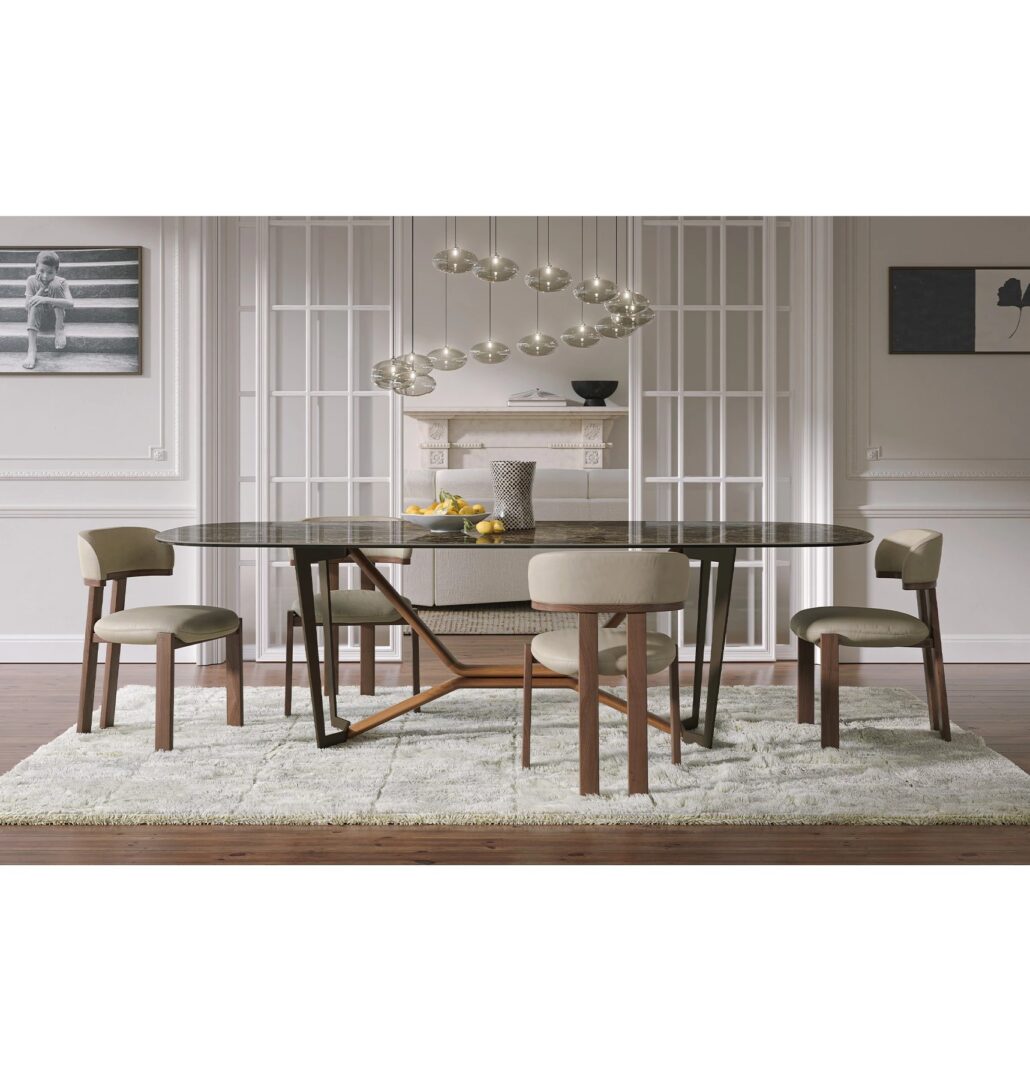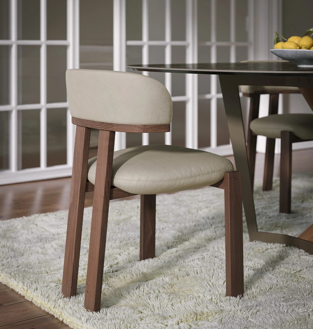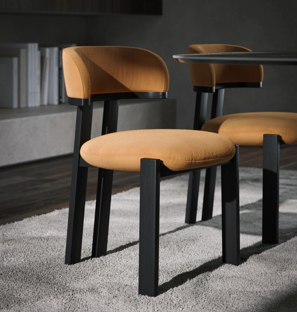Этот стул выделяется своим балансом между основными формами и изысканным комфортом. Мягкое сиденье, мягкое и уютное, усиливается контрастом с прочной конструкцией из массива дерева, которая подчеркивает его силуэт. Спинка, легкая, но решительная, визуально прерывает линии задних ног, создавая динамичную игру объемов и пропорций.
