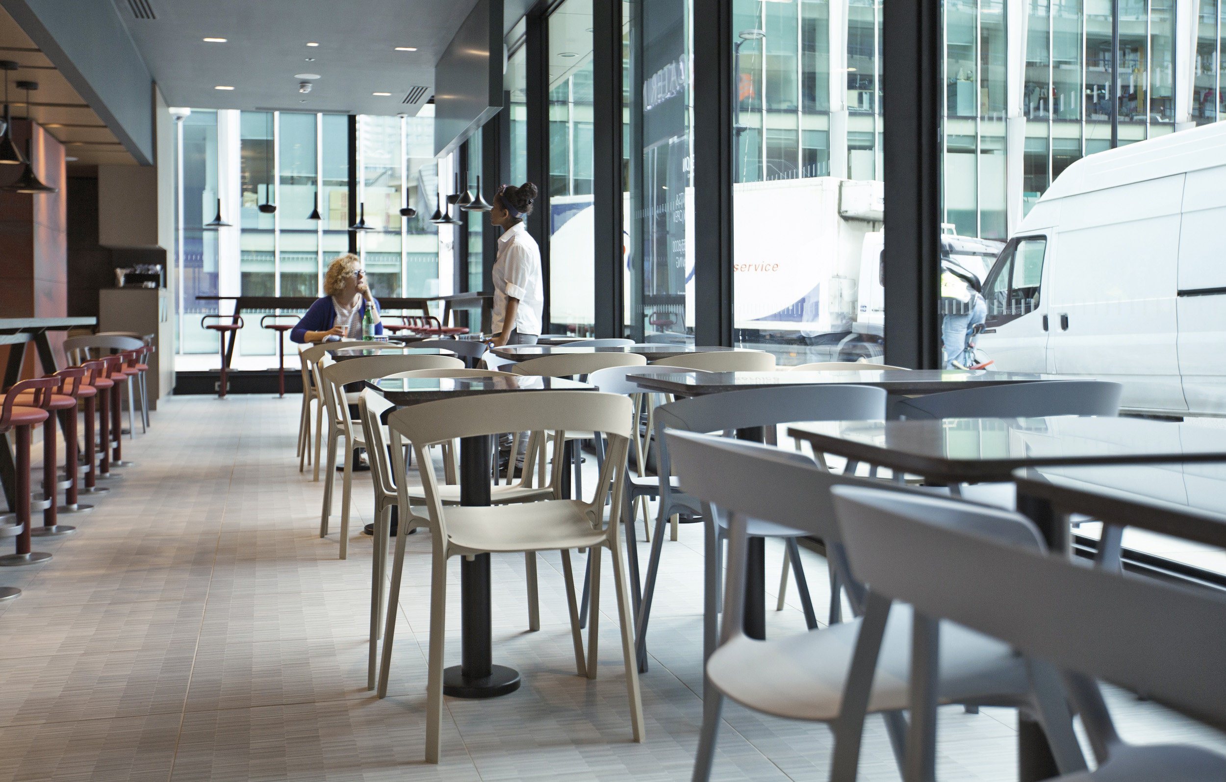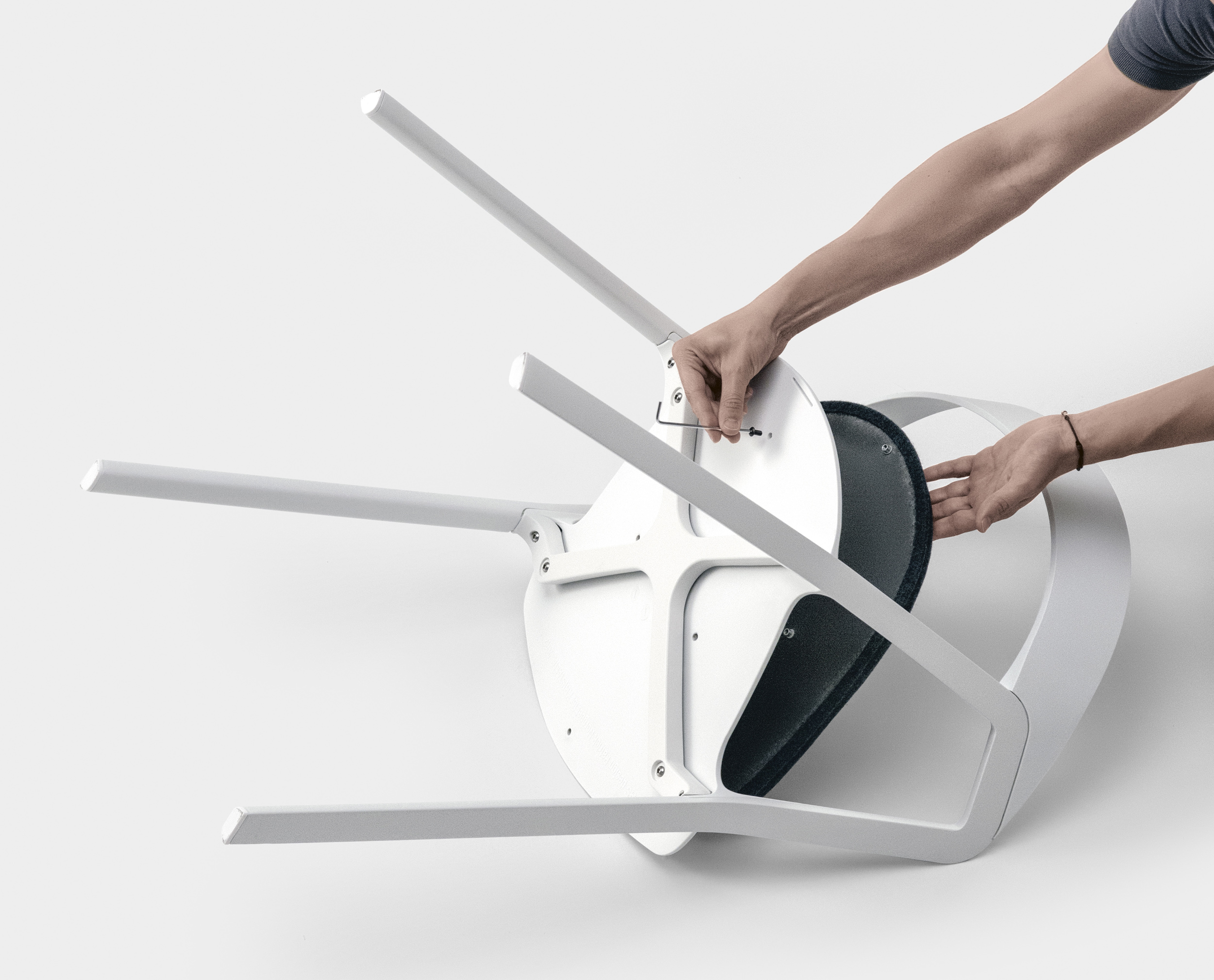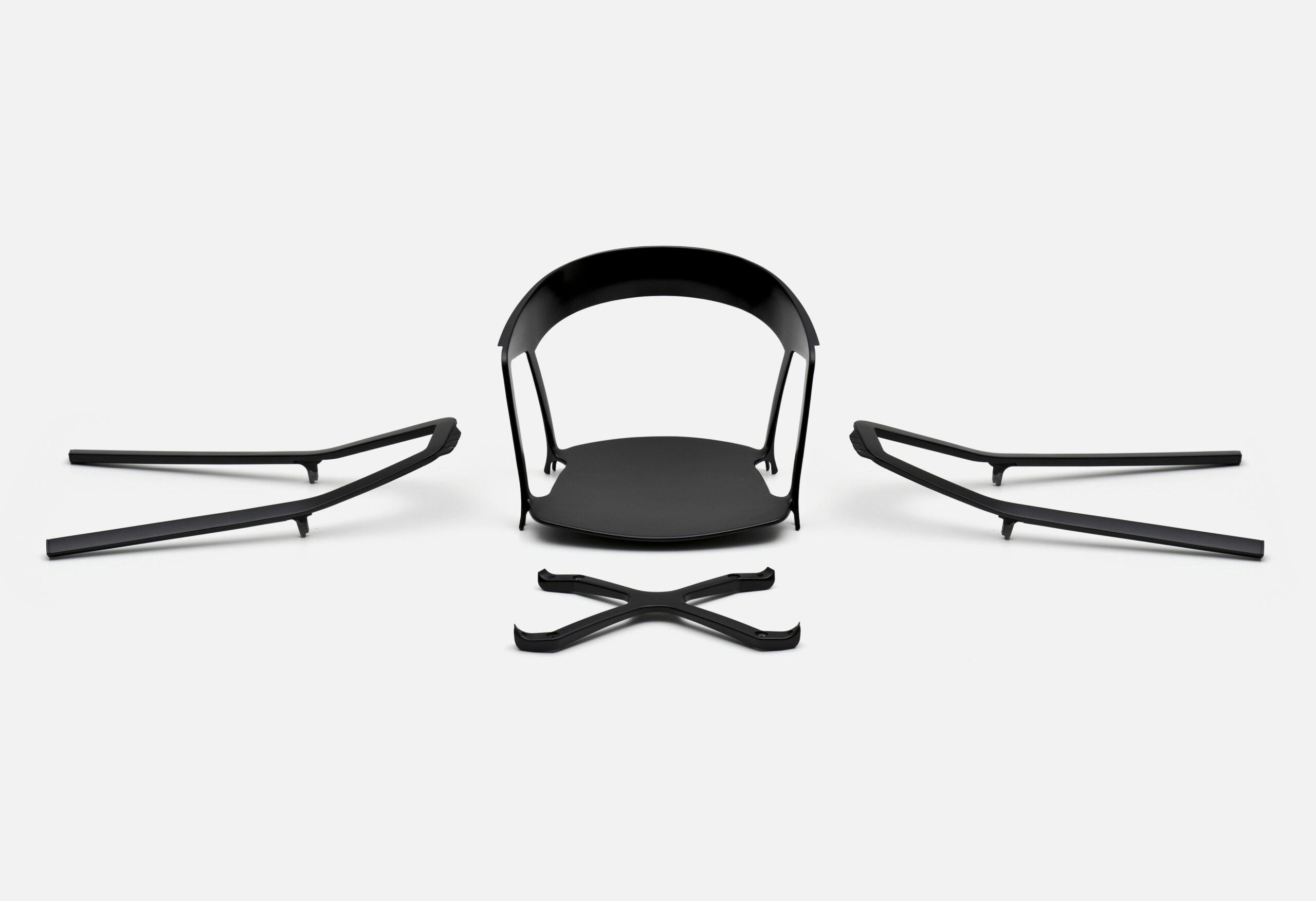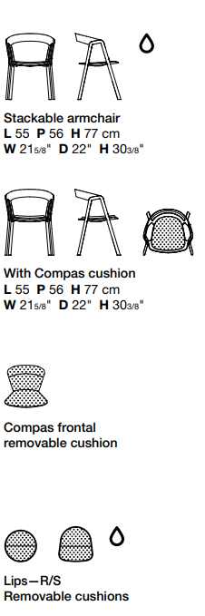 Исследования в области материалов являются одной из движущих сил творчества Патрика Норгета, который успешно сочетает инновации с элегантностью в создании кресла Compas. Его сиденье изготовлено из PA6, прочного пластика. Ножки с перевернутым V-образным наклоном, напоминающим стержни циркуля, изготовлены из литого под давлением алюминия и покрыты порошковой краской того же цвета, что и сиденье. Кресло Compas становится еще более удобным благодаря дополнительным подушечкам-липучкам или подушкам, изготовленным на заказ, которые могут быть изготовлены из доступных тканей и прикреплены к сиденью четырьмя винтами.