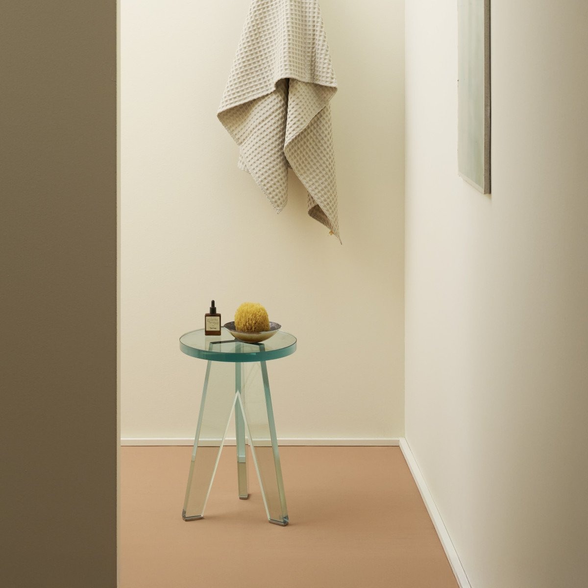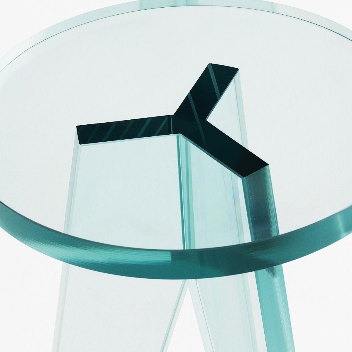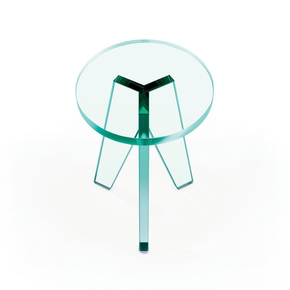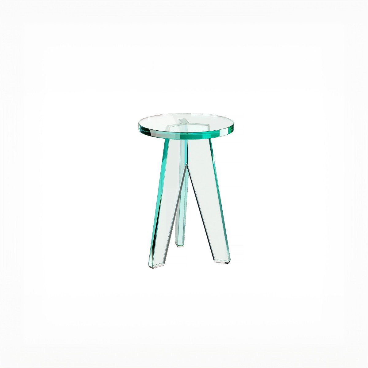 Табурет или приставной столик из закаленного прозрачного стекла толщиной 24 мм, скрепленного ультрафиолетовым излучением. В результате сложных производственных процессов был создан предмет, полностью выполненный из стекла, с высокой устойчивостью к нагрузкам и мастерски проработанными деталями. Ножки из нержавеющей стали, отполированные до зеркального блеска, дополняют и украшают этот предмет.