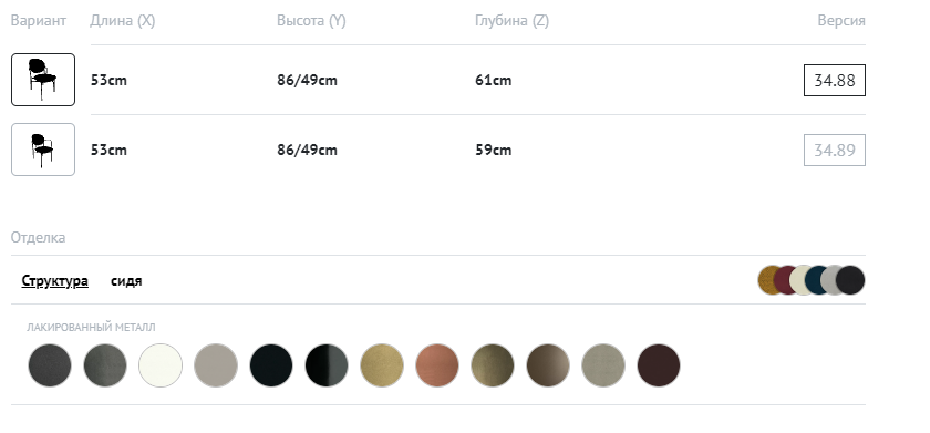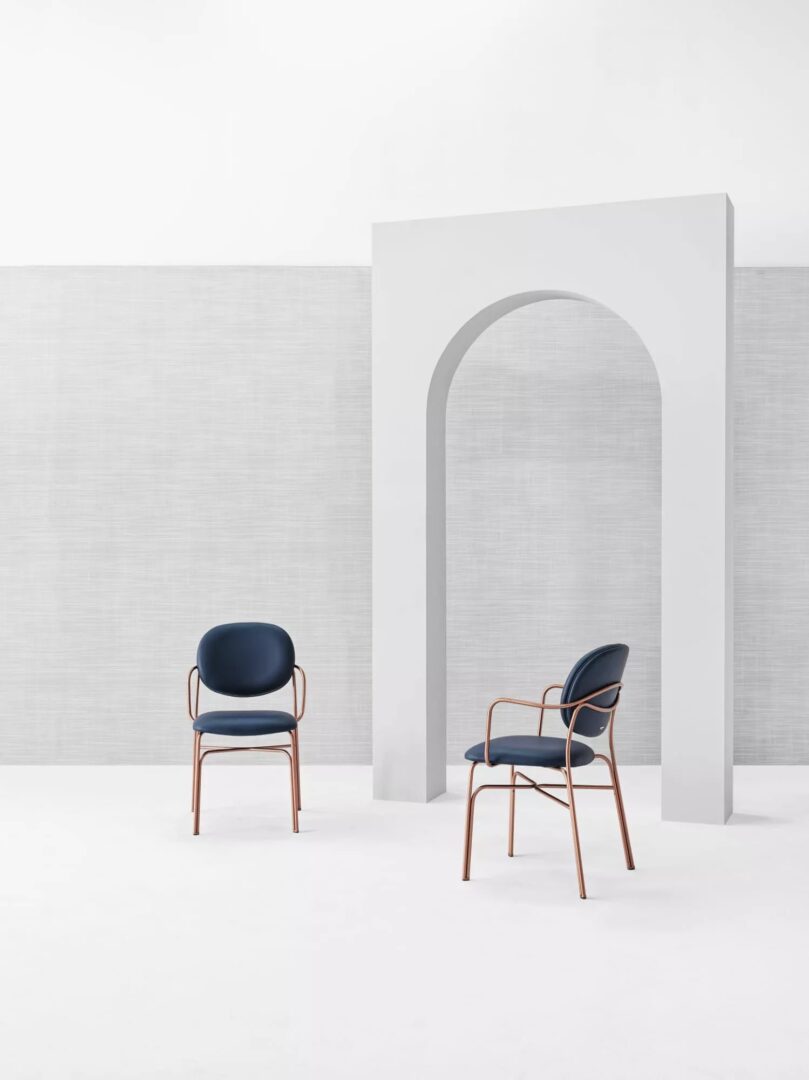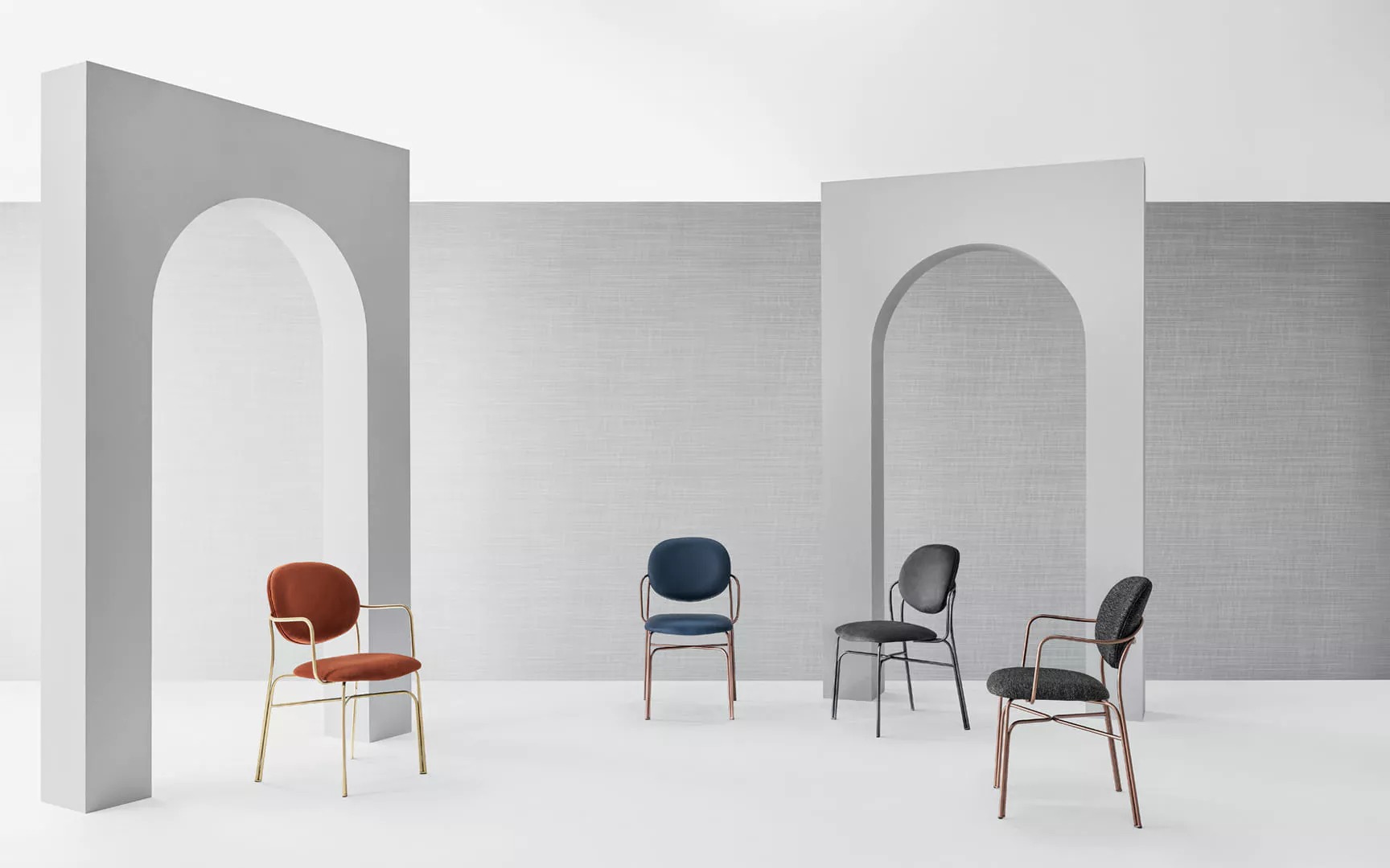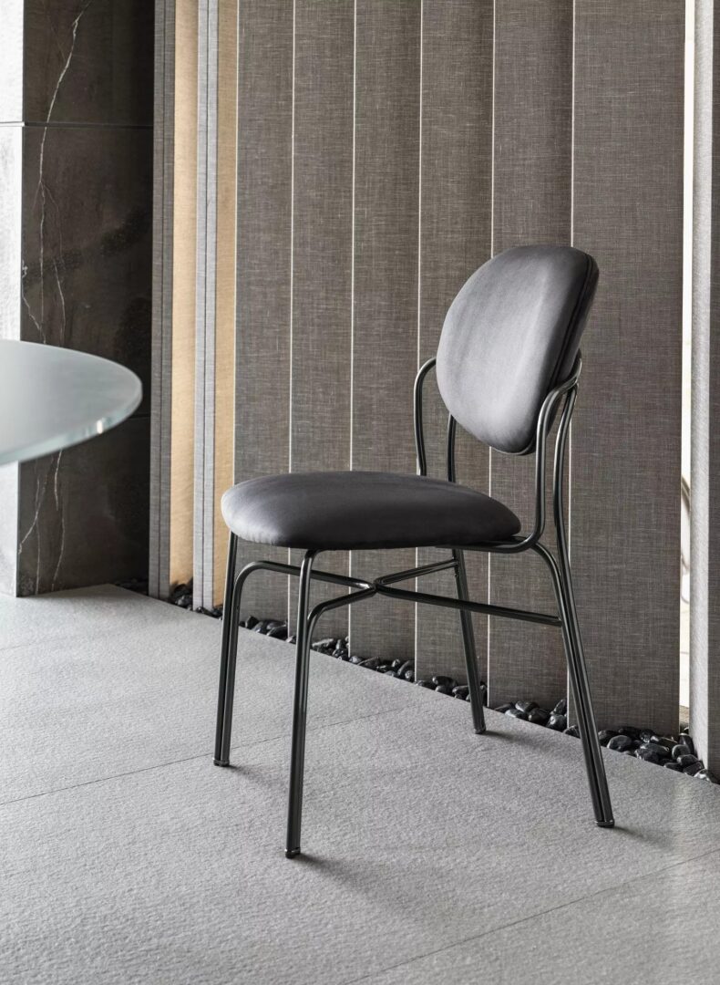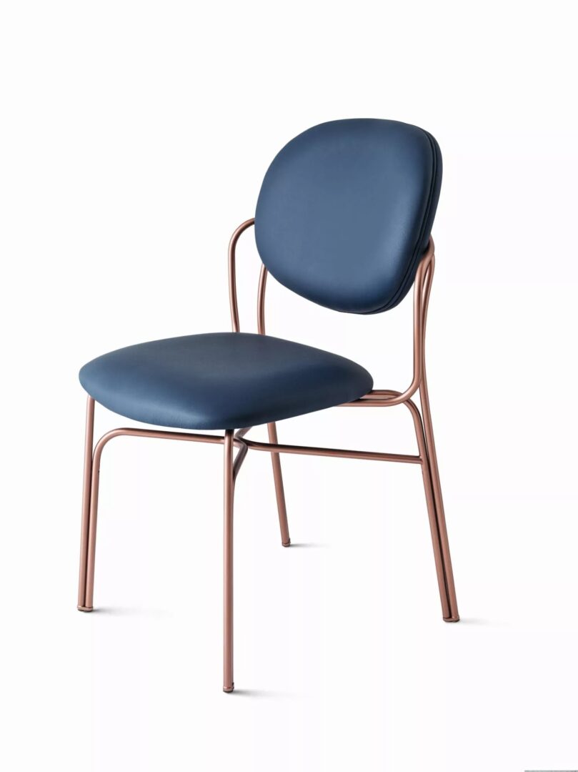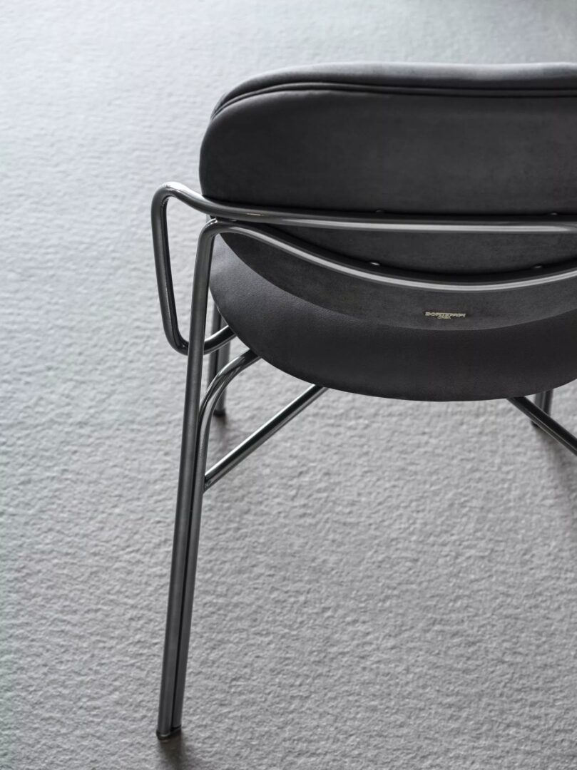 Стул со структурой из лакированной стали с подлокотниками и без подлокотников. Cидение в обивке из экокожи, экологическая кожа премиум, технического бархата,ткани Nordic, чистой шерсти, бархата, , ткани Kvadrat field, ткани Kvadrat Coda и кожи премиум.