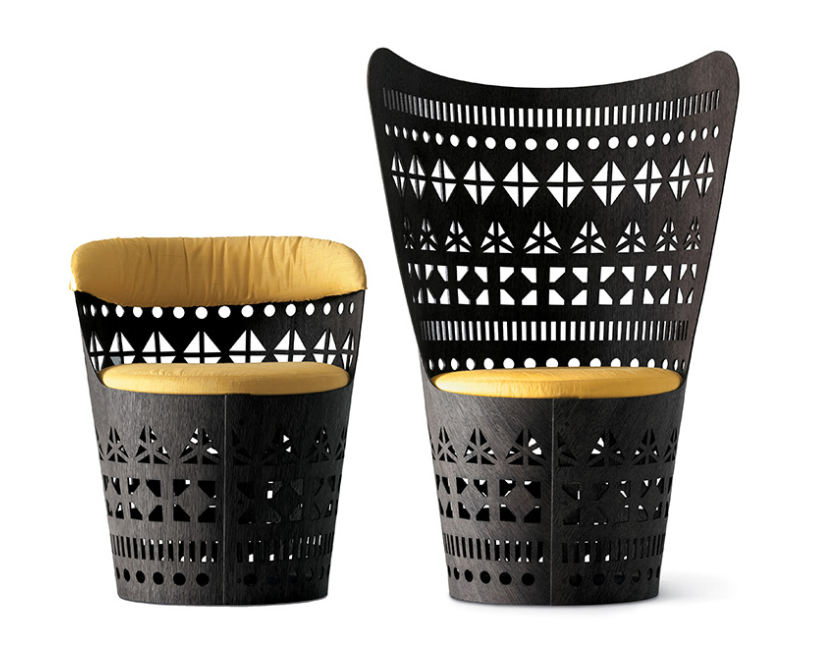 Сеансы, интерпретирующие этнические воспоминания в современном ключе.Moderna. Изготовлены из одного гибкого листа перфорированной фанеры. В комплект входят подушки для сидений и спинки из широкого спектра тканей.