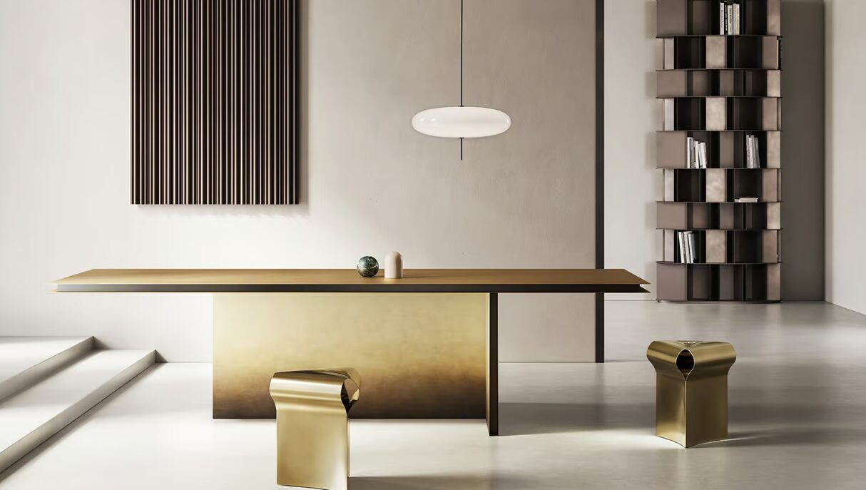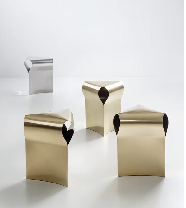 Табурет Efesto — это не просто мебель, это скульптура для дома, которая подчеркивает производственные возможности бренда: благодаря изгибу листового металла латуни вручную придают форму и чеканку, создавая уникальное треугольное поперечное сечение. Полированная отделка еще больше подчеркивает его извилистую форму.
