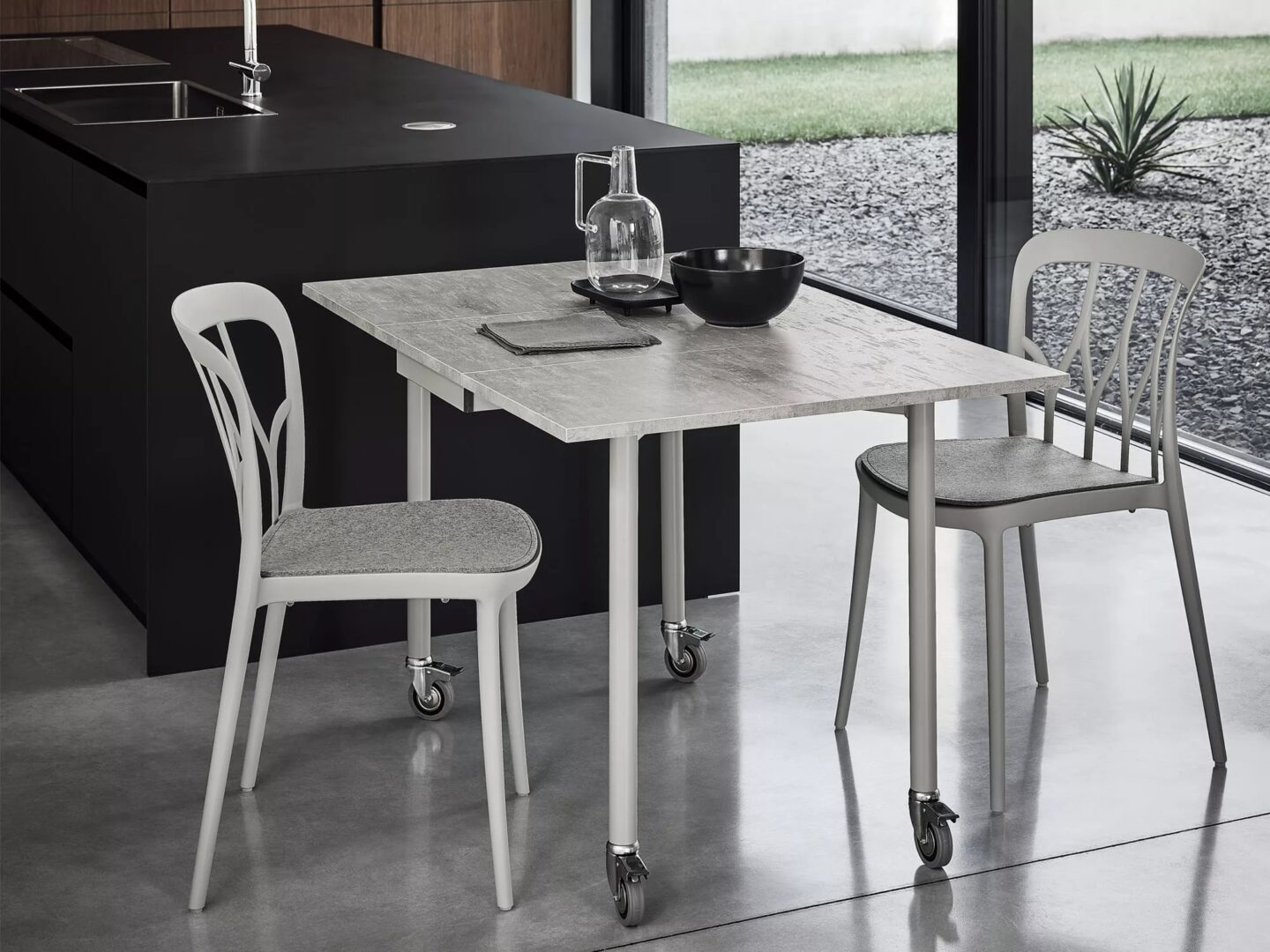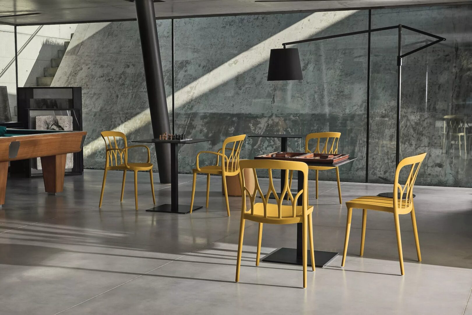 Стул и стул с подлокотниками с цельной структурой из полипропилена и рекуперируемого стекловолокна. Штабелируемый и даже для использования вне помещений.