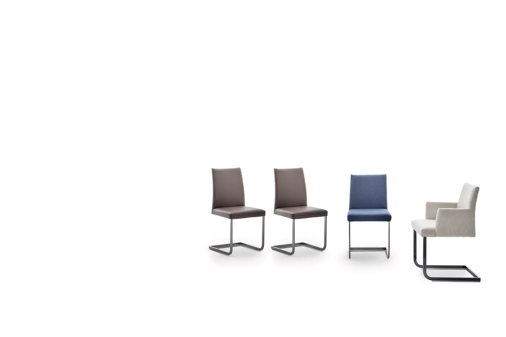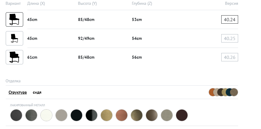 Стул и кресло со структурой из лакированной или хромированной стали, монолитное сидение мягкое и обитое.