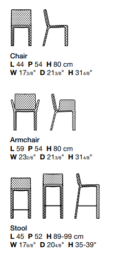 Стул отличается продуманной эргономикой и высоким качеством исполнения, характерным для итальянской мебели. Коллекция включает также модели с подлокотниками и табуреты разной высоты, сохраняя единство стиля.