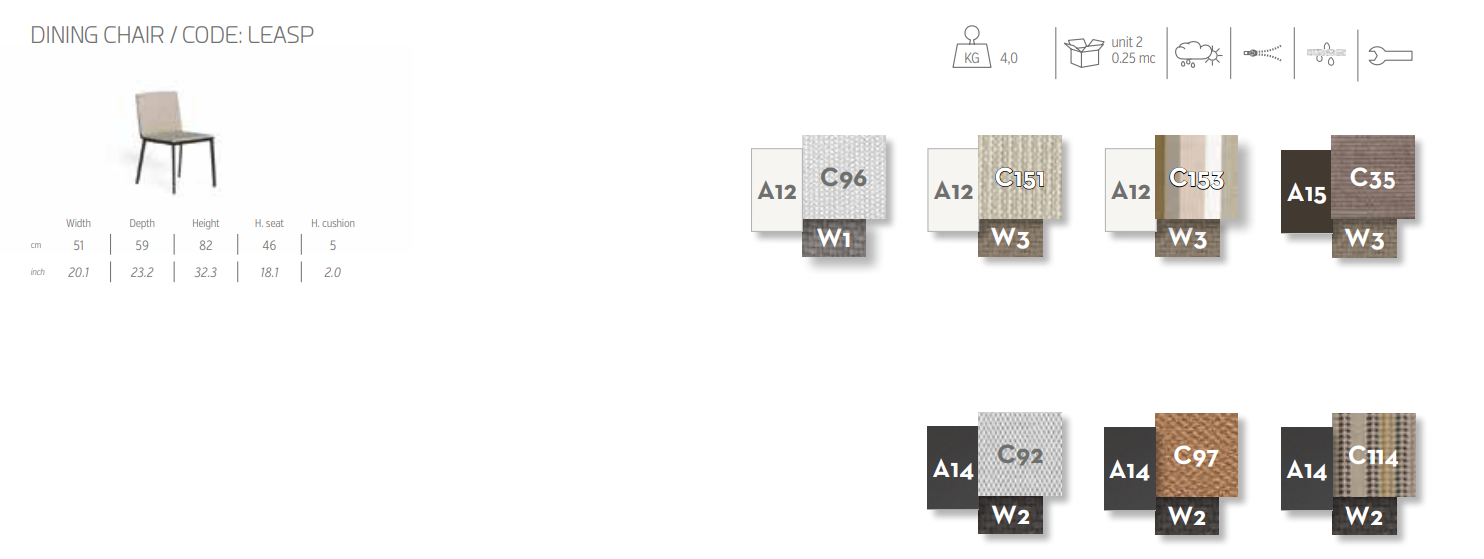 Обеденный стул из коллекции Leaf отличается элегантными формами и тонкими линиями. Мягкое сиденье, набитое пенопластом quick foam, обтянуто влагостойкой тканью. Алюминиевая конструкция в сочетании с уникальными тканями делают изделие соответствующим дизайну всей коллекции.