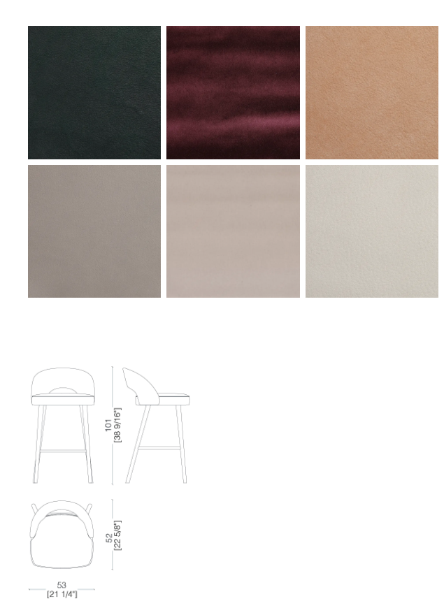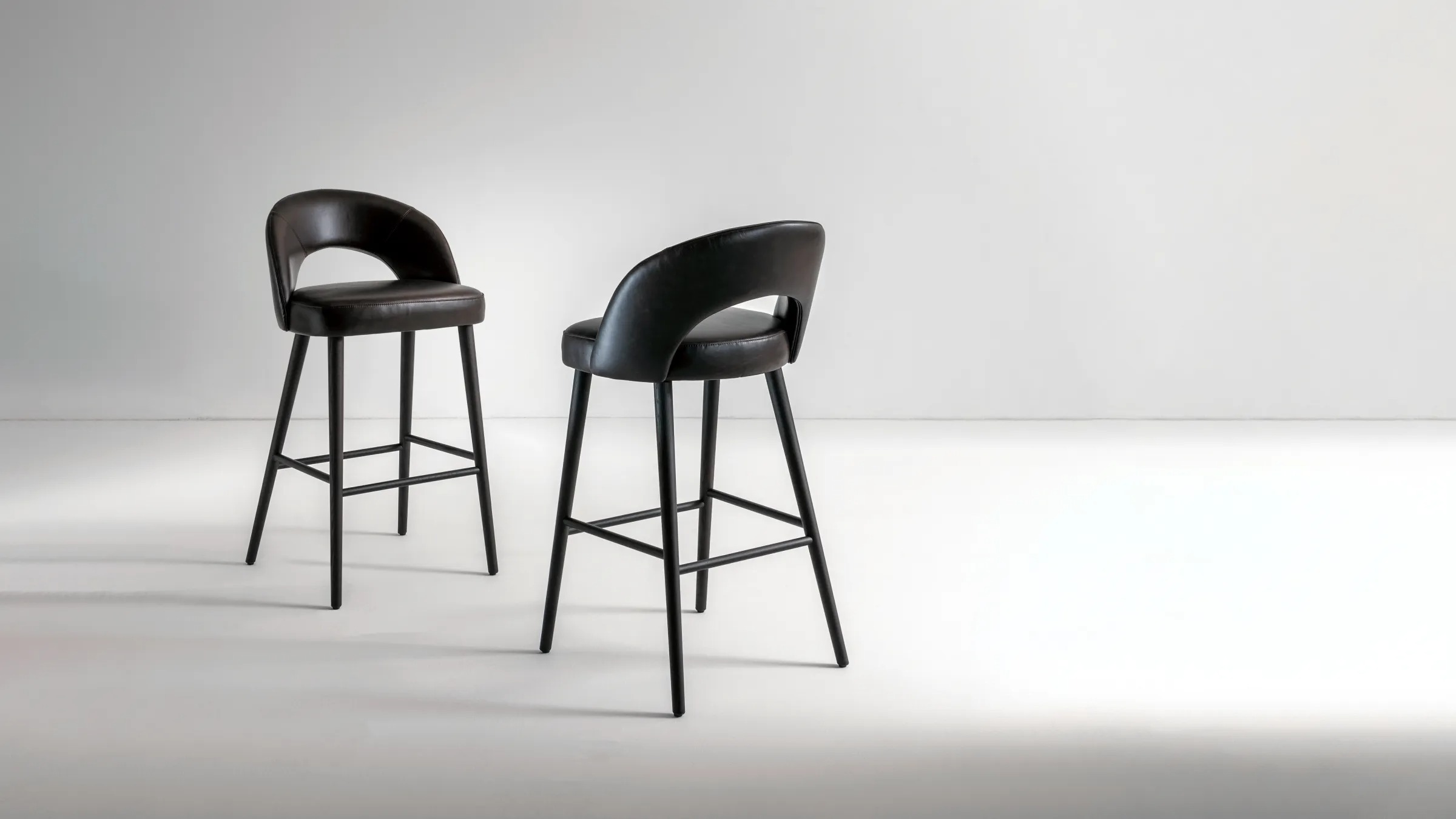 Высокий обитый барный стул с ножками из натурального ясеня, окрашенного или лакированного, обтянутый кожей, бархатом или тканью.