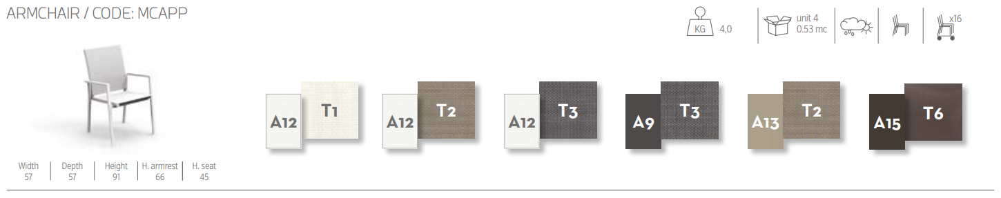 Благодаря большому сиденью и спинке кресло Maiorca является удобным, расслабляющим и функциональным изделием. Кресло идеально подходит как для гостиной, так и для обеденной зоны на открытом воздухе и гарантирует устойчивость и элегантность. Каркас, доступный в двух цветах (белый и голубовато-серый), выполнен из алюминия, а сиденье и спинка, доступные в трех цветах (белый, мокка, голубовато-серый), изготовлены из текстиля. Возможность штабелирования изделия делает его удобным и компактным даже в холодное время года.