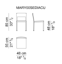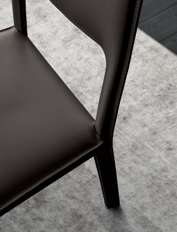 Сиденье состоит из стальной рамы и полностью обтянуто седельной кожей. Оно поставляется без подлокотников, поэтому полупустая спинка становится отличительным стилистическим элементом. Деталь, разработанная для обеспечения максимального комфорта, представляет собой точку захвата для удобного перемещения кресла.