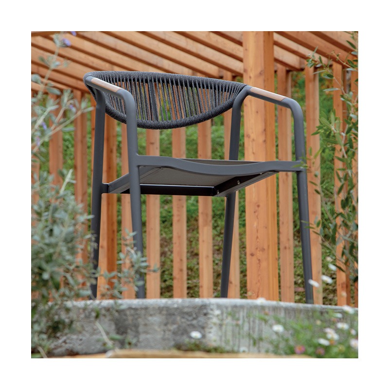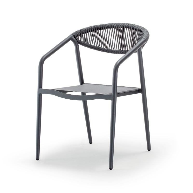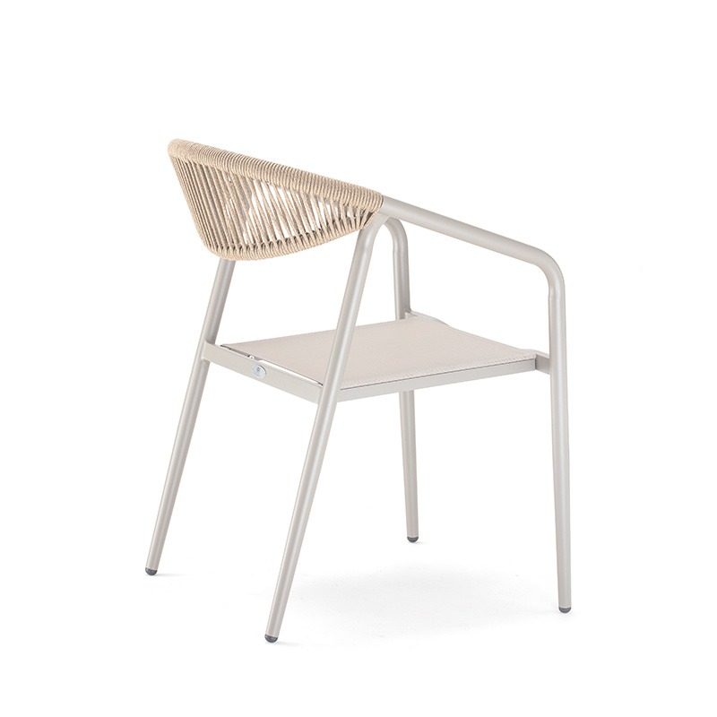 Алюминиевый складывающийся стул, обтянутое полиэстеровым тросом. Сиденье из текстилена.