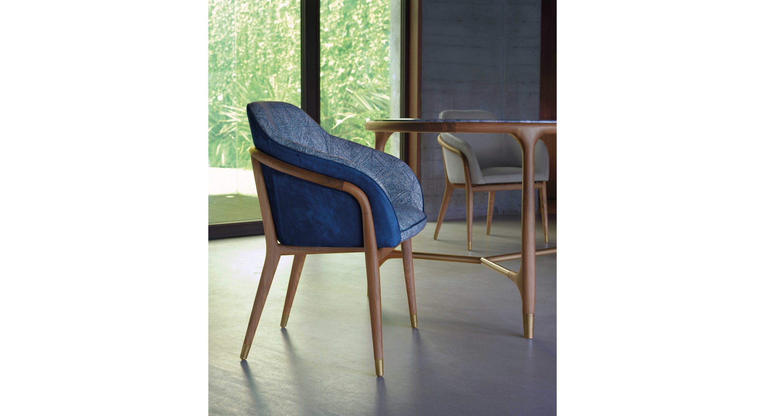 Внутренняя структура: Многослойная изогнутая древесина ели. Обивка подушек: Подушка для сидения, спинки и подлокотников : Пенополиуретан различной плотности. Обивка: Высококачественная кожа или ткани доступны в различных категориях. Внешняя конструкция, основание и ножки: Ножки из цельного дерева, доступны из американского ореха, дуба или ясеня. Торцевые крышки из латуни с различной отделкой.