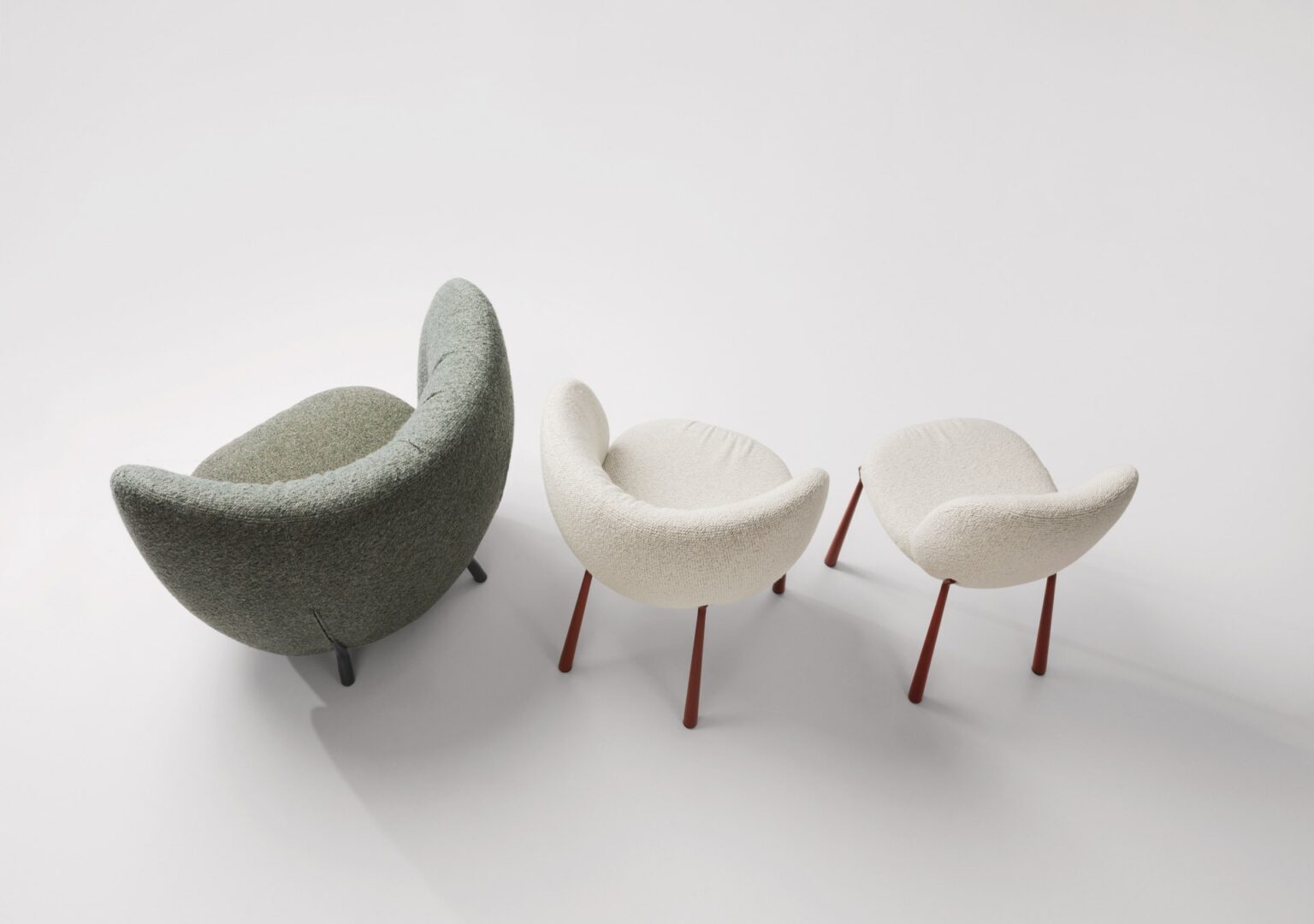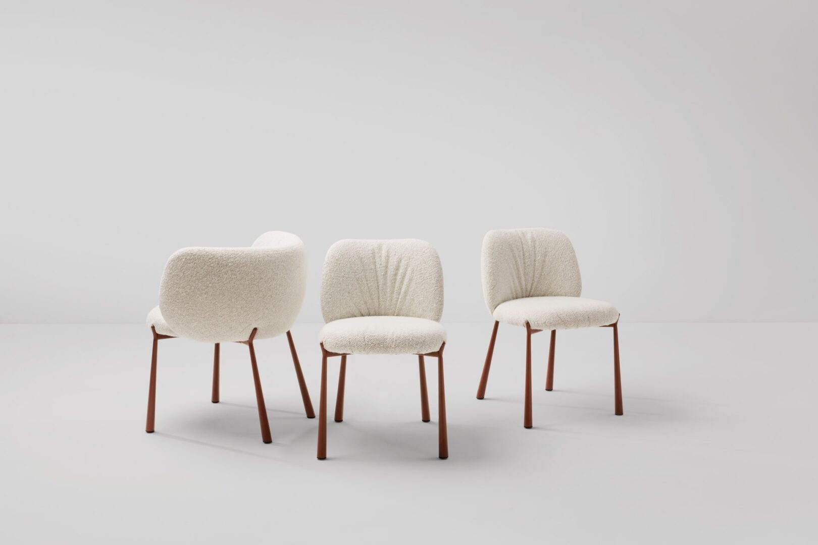Стул Mys с металлическим основанием на четырех ножках. Сиденье и спинка обиты кожей, искусственной кожей и тканью с заметными складками.
