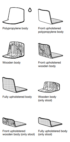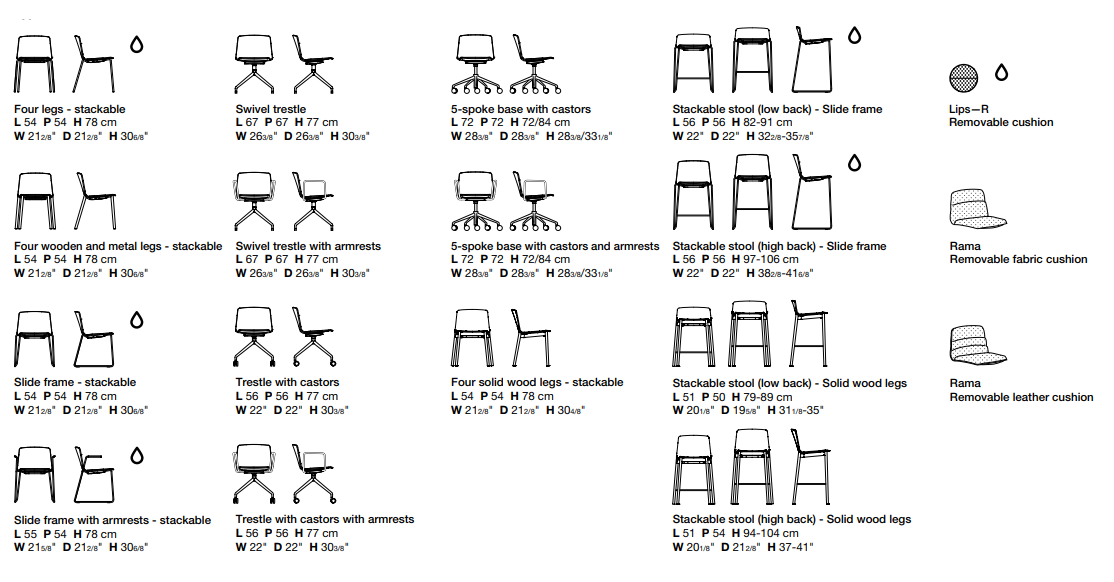 Штабелируемый стул с особым стилем, выполненный из изогнутой фанеры или, в качестве альтернативы, из армированного полипропилена, отлитого под давлением. Каркас доступен во многих вариантах: с ножками из цельного дерева, также демонстрирующими высокое качество исполнения, с четырьмя ножками или на трубчатой металлической выдвижной раме с подлокотниками или без них. Кроме того, доступны два новых табурета, которые также можно штабелировать, разной высоты. Конструкция также доступна в варианте с мягкой обивкой, обитой либо полностью, либо спереди высококачественными тканями и кожей на выбор, что позволяет создавать множество цветовых сочетаний с каркасами. По запросу Rama может быть оснащена отверстием для отвода воды и дополнена съемной подушечкой для губ для дополнительного комфорта и дополнительных цветовых решений.