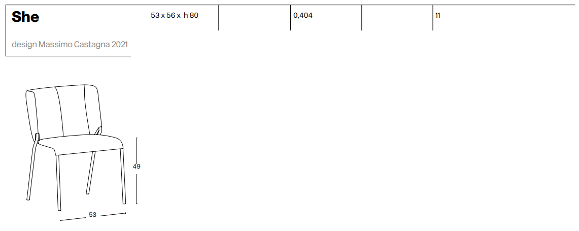 She-это стул с современным и неподвластным времени дизайном, рожденный проектом Массимо Кастаньи. Союз, в котором искусство искусства объединяется с инновационными технологиями, чтобы обставить как домашнюю обстановку, так и контрактную среду.