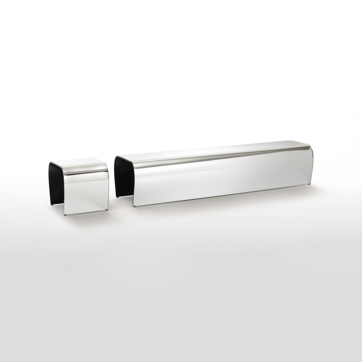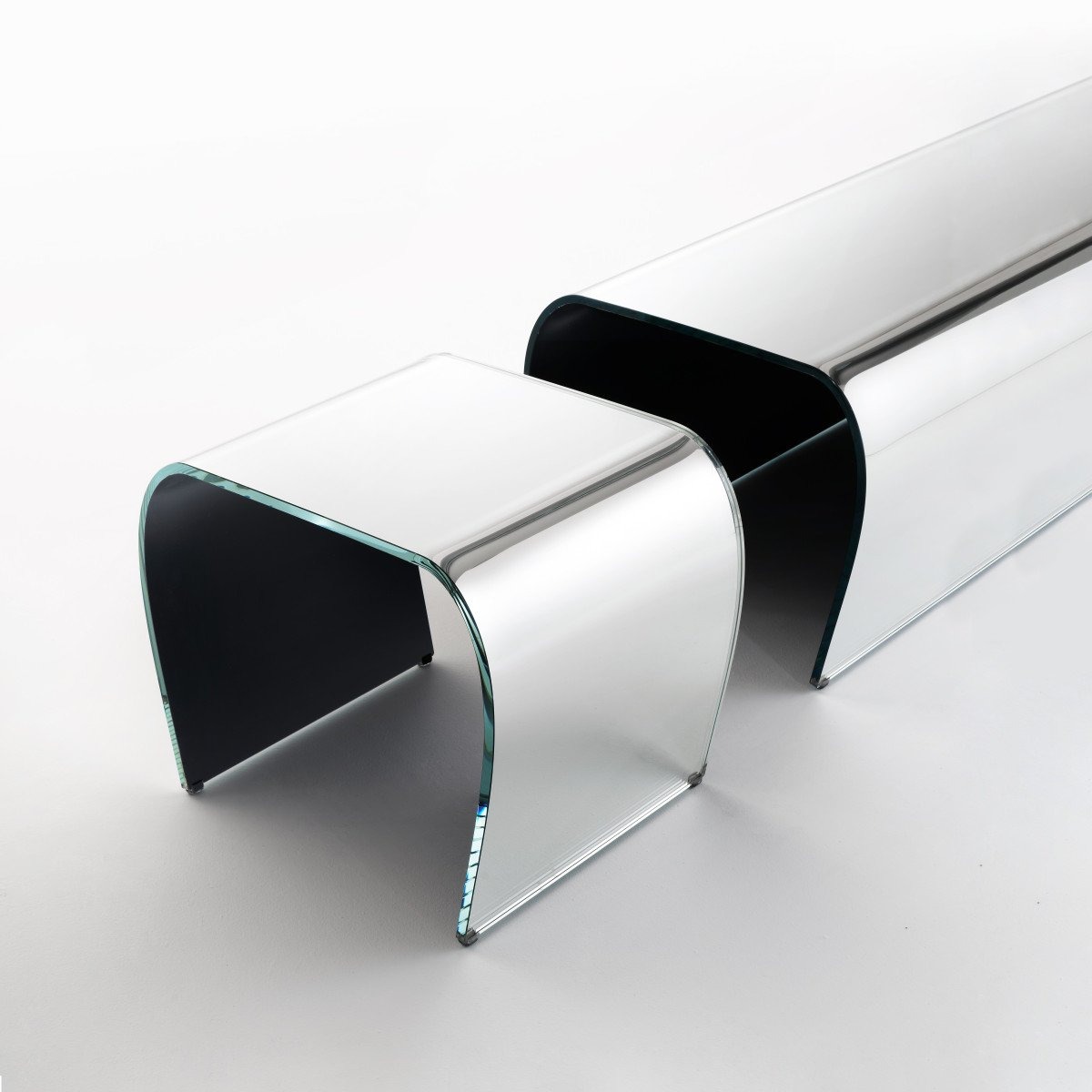 Скамья и табурет с естественной простотой изготовлены из профилированного и изогнутого прозрачного сверхлегкого стекла толщиной 12 мм. Особая кривизна стекла и специальный процесс закалки придают стеклу исключительную устойчивость к нагрузкам. Также доступна версия из серебристого стекла с изысканным внешним видом.