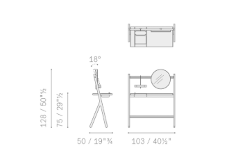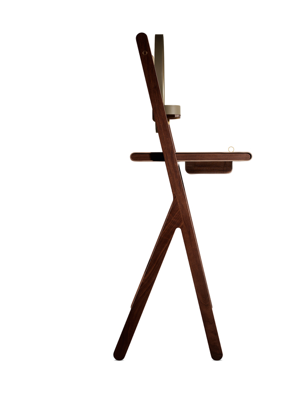 Зеркала Ren, разработанные для придания дому сдержанного и комфортного стиля, доступны в виде круглого зеркала (Ø 430 мм) или овального зеркала (280 x 1200 мм), также отдельно, и в настольном исполнении (Ø 310 мм). Они имеют латунную раму, обтянутую кожей Saddle Extra, а задняя панель выполнена из березовой фанеры со шпоном грецкого ореха Canaletto. Настольное зеркало состоит из круглого зеркала, закрепленного на несущей конструкции с помощью стального крючка из матовой стали с латунной отделкой. Отдельно стоящая зеркальная вешалка для одежды состоит из овального зеркала, низкой полки и двух крючков для развешивания одежды. Настенная зеркальная вешалка для одежды состоит из бруска орехового дерева Canaletto, к которому прикреплены круглое зеркало, круглый лоток для ключей и два крючка для развешивания одежды (система настенного крепления в комплект не входит). Туалетный столик состоит из круглого зеркала, овального лотка для ключей и столешницы со вторым встроенным отделением с поднимающейся крышкой из кожи Saddle Extra и латунной ручкой в форме кольца.