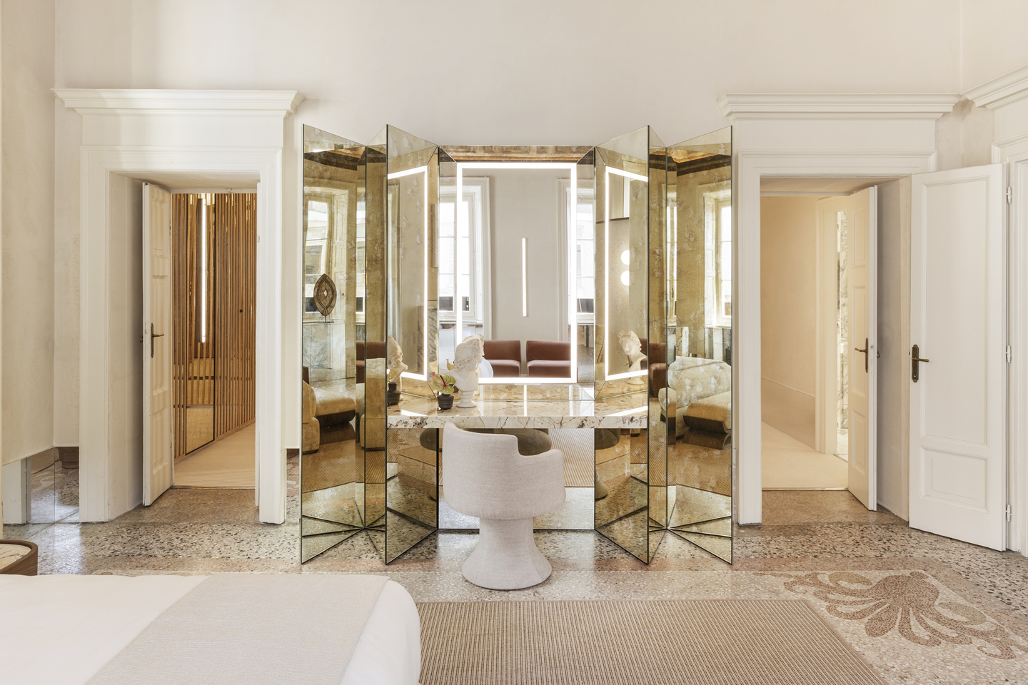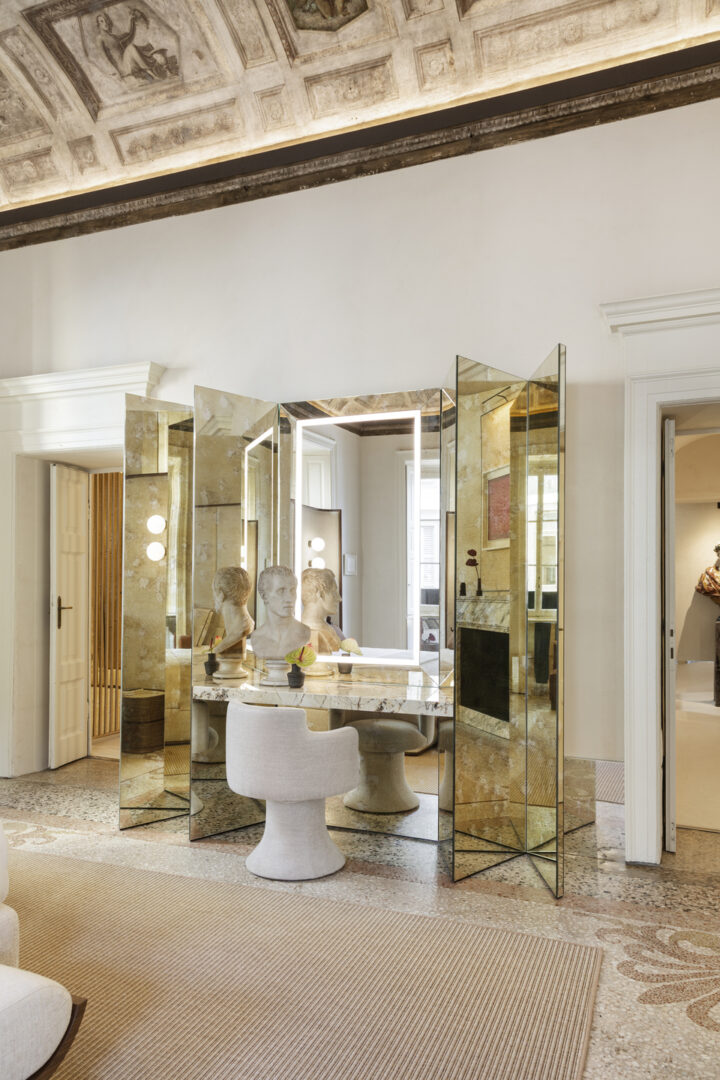 В центре большее пространство поддерживает, казалось бы, подвесную мраморную столешницу, придавая этому материалу легкий визуальный эффект. Внутри мраморной столешницы есть скрытый ящик, идеально подходящий для хранения личных вещей. Центральный элемент зеркала с подсветкой добавляет яркости, помогая ослабить эффект ширмы и обогатить окружающую среду стилем и функциональность.