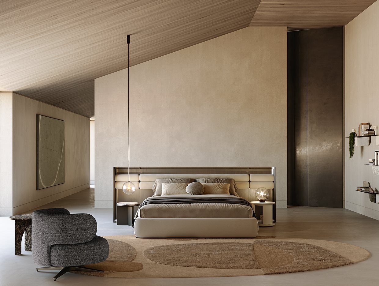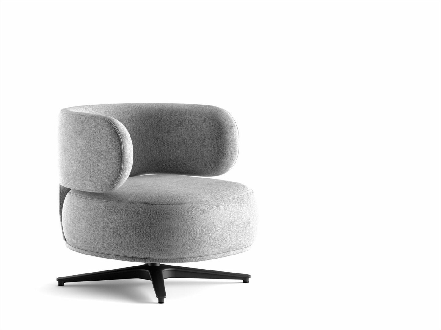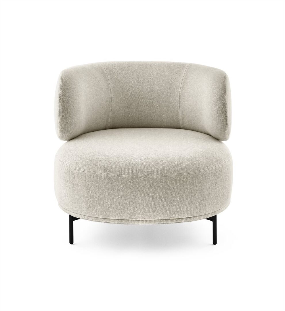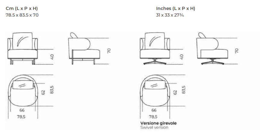 Кресло с внутренней металлической рамой, обитое пенополиуретаном различной плотности и полиэфирным волокном. Металлическая подставка окрашена в цвет «теплый серый». Поставляется с пуховой подушкой 60×60 см, покрытой тем же покрытием. Съемное покрытие из ткани или кожи в цветах образца. Доступна версия с поворотным движением на 180° С возвратом с 4-спицевой подставкой из металла, окрашенного в цвет «теплый серый» с концами.