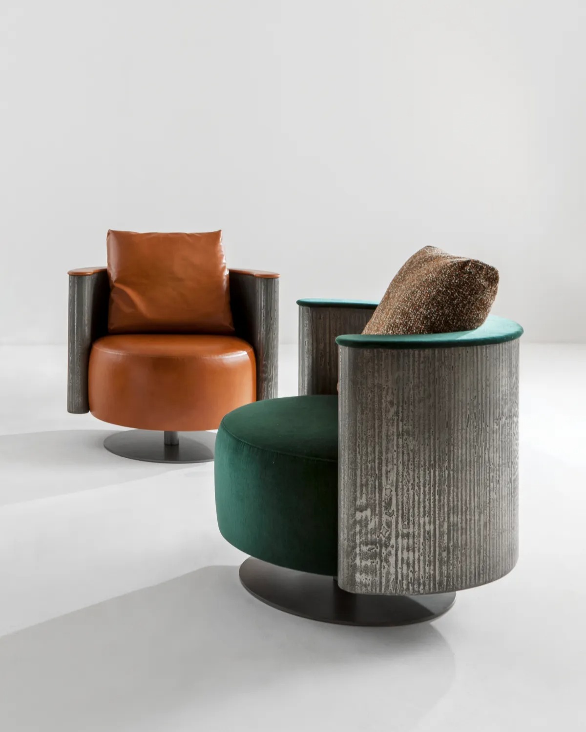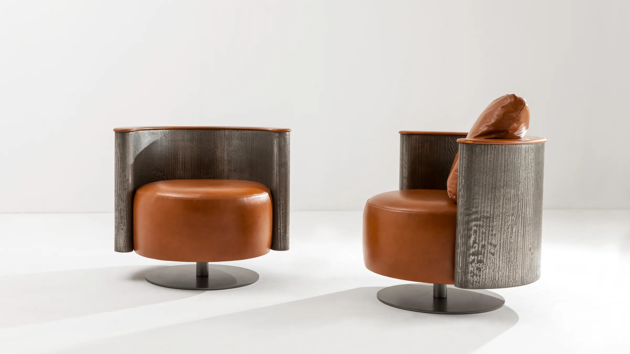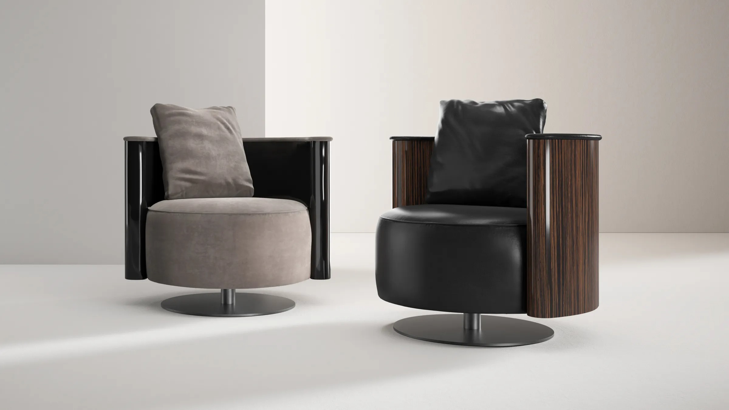 Вращающееся кресло с обтекаемым корпусом из гладкого дерева, лакированного дерева или со специальной отделкой, а также с отделкой Жидкий металл. Вставка в корпусе с той же отделкой, что и сиденье.