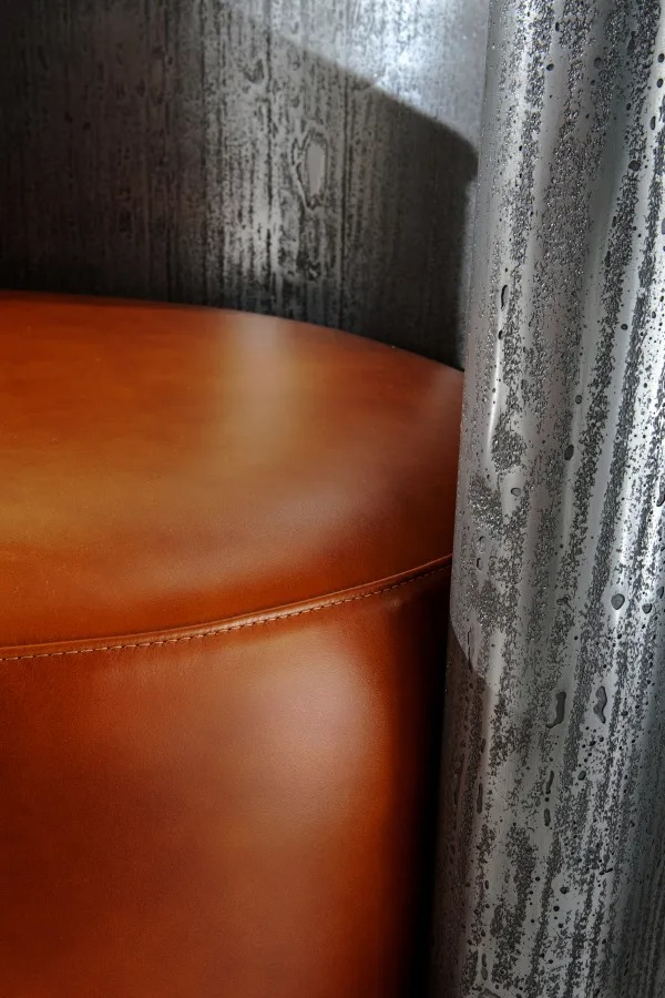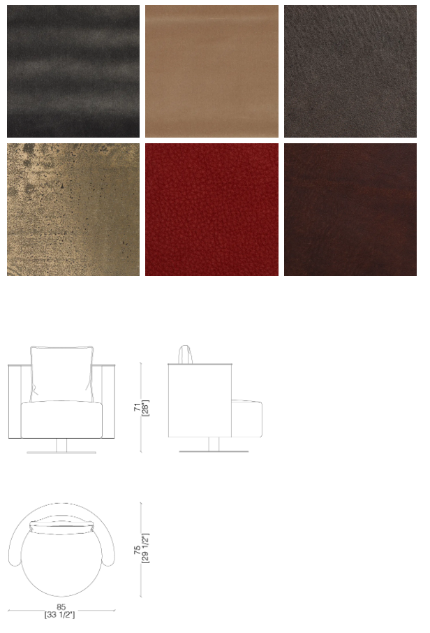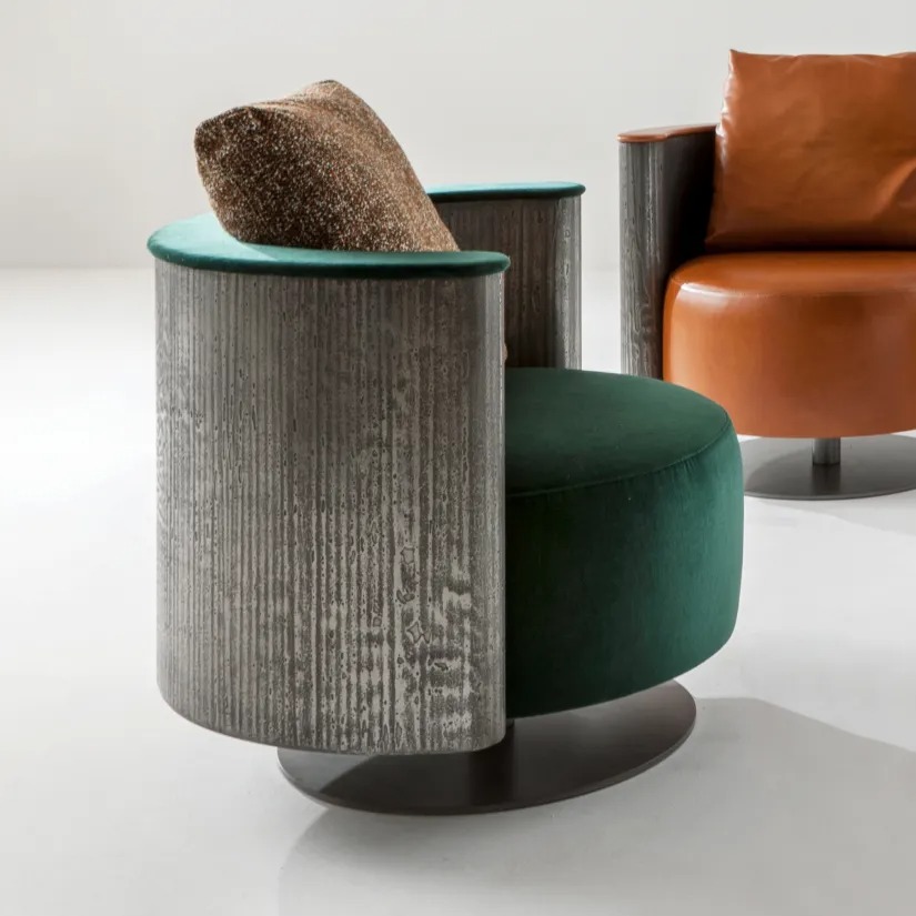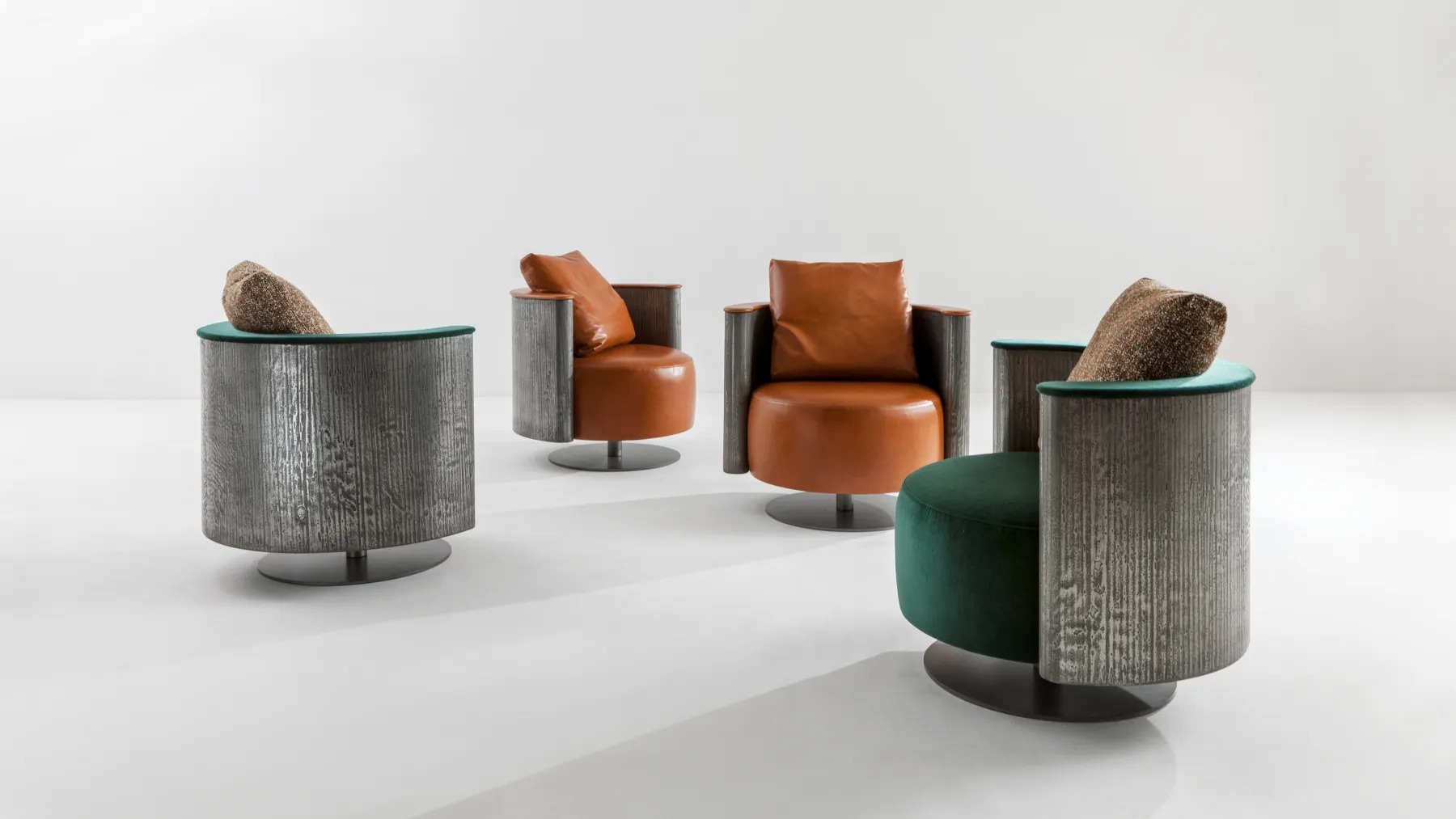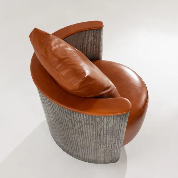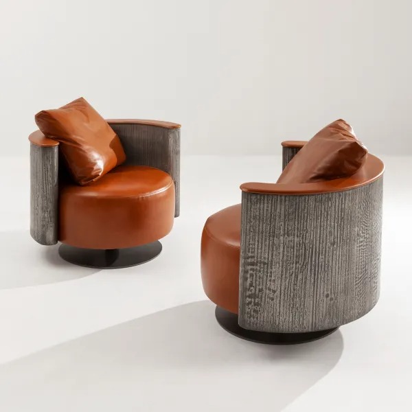 Вращающееся кресло с обтекаемым корпусом из гладкого дерева, лакированного дерева или со специальной отделкой, а также с отделкой Жидкий металл. Вставка в корпусе с той же отделкой, что и сиденье.