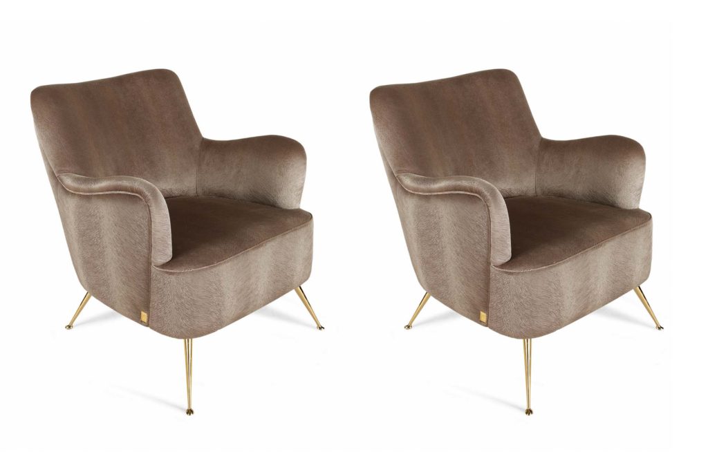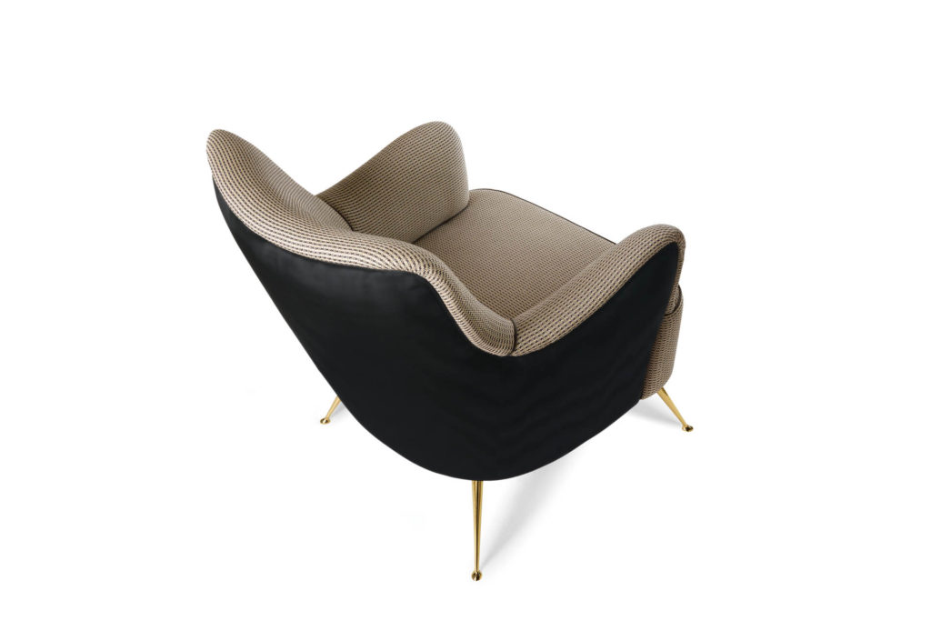 Кресло с культовым и современным дизайном с металлическими ножками и золотой отделкой. Элегантность ее линий позволяет ей знать, как жить в гармонии в различных средах и контекстах.