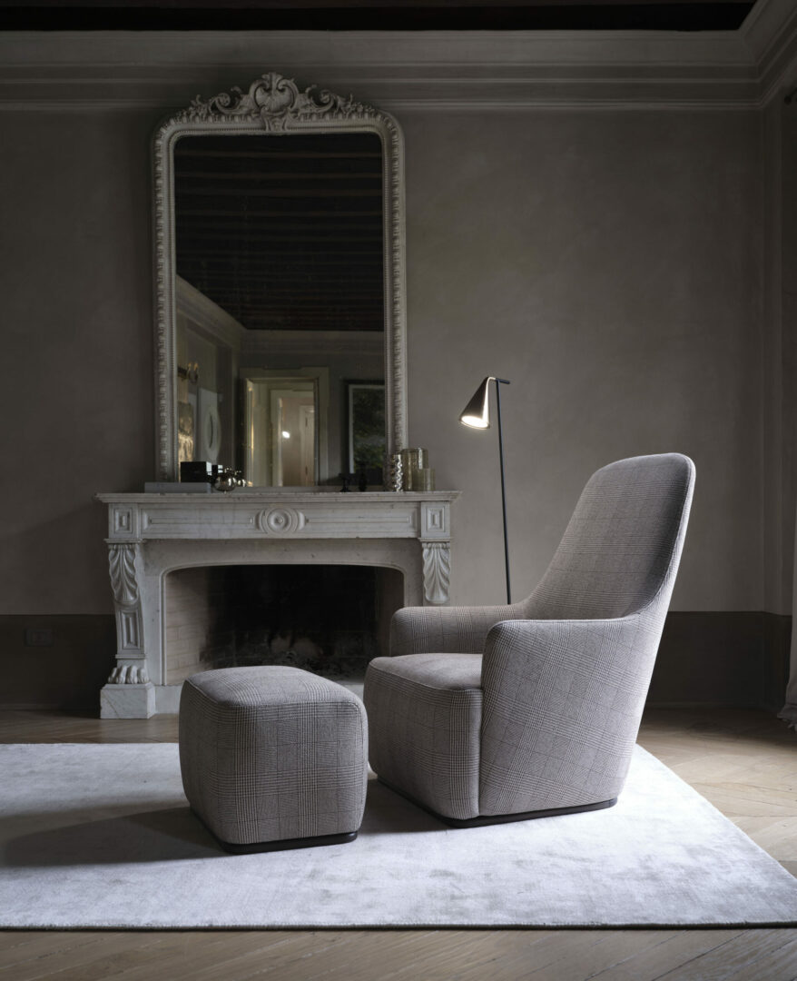 Кресло Bergère, созданное по мотивам кресел, популярных во Франции 17 века, отличается высокой спинкой, полностью обитой полиуретаном высокой плотности и пеной с эффектом памяти, что обеспечивает исключительный комфорт. Кресло доступно с тканевой или кожаной обивкой.