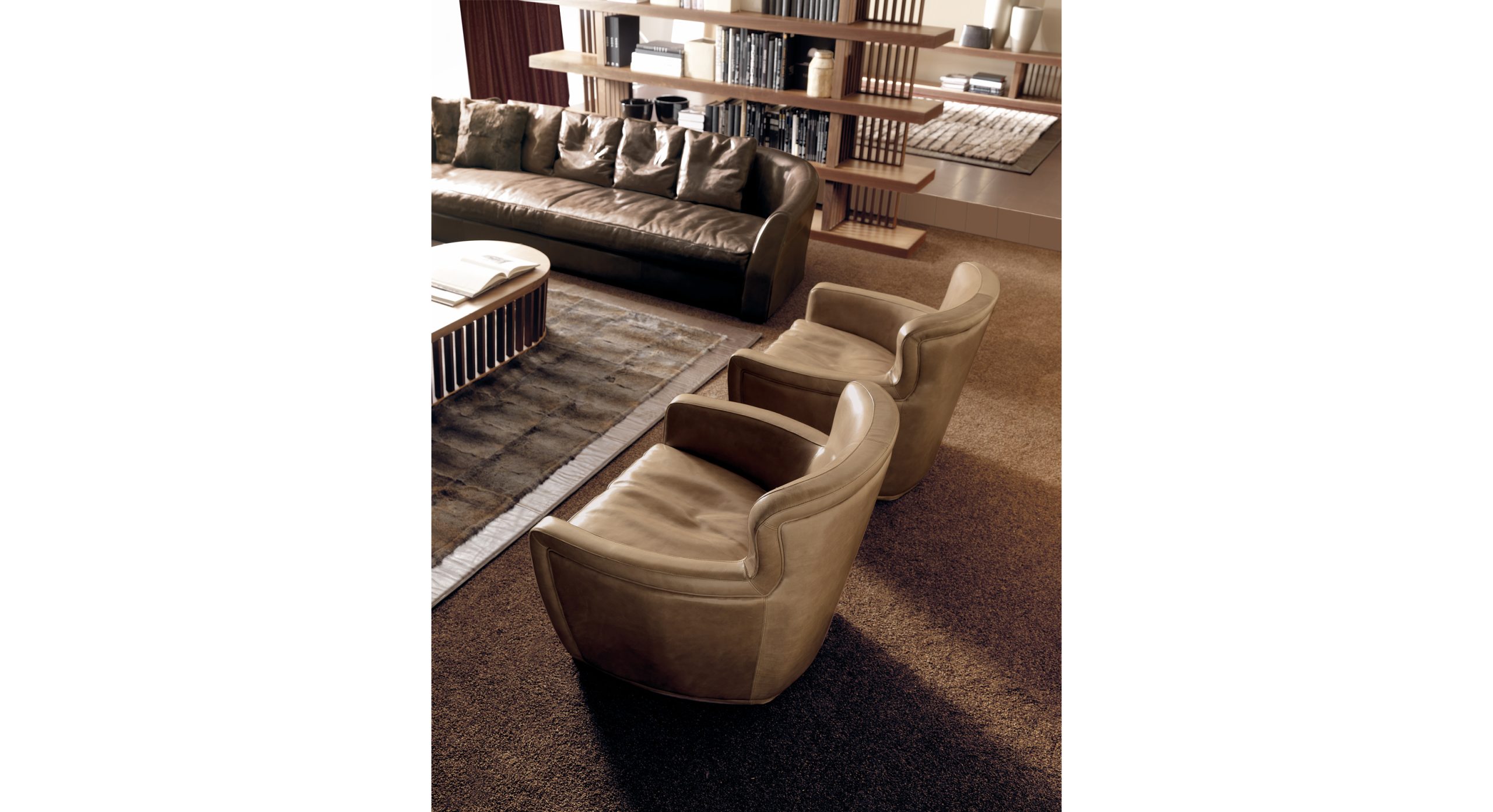 Внутренняя структура: Многослойная изогнутая древесина ели. Обивка подушек: Подушка для сидения: Поверхностная обивка из натуральных стерилизованных гусиных перьев. Середина из пенополиуретана различной плотности. Спинка и подлокотники : Пенополиуретан различной плотности. Обивка: Высококачественная кожа или ткани, доступные в различных категориях. Внешняя структура, основание: Массив ореха, полностью обтянутый кожей или тканью.
