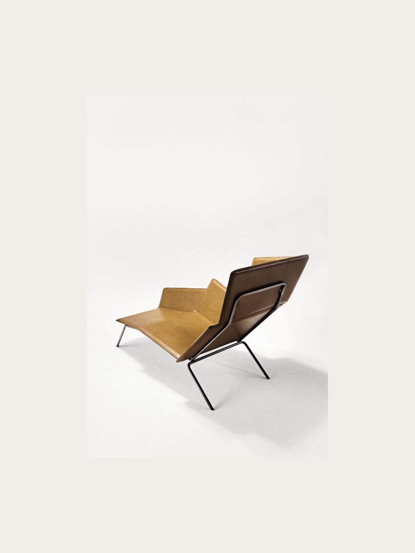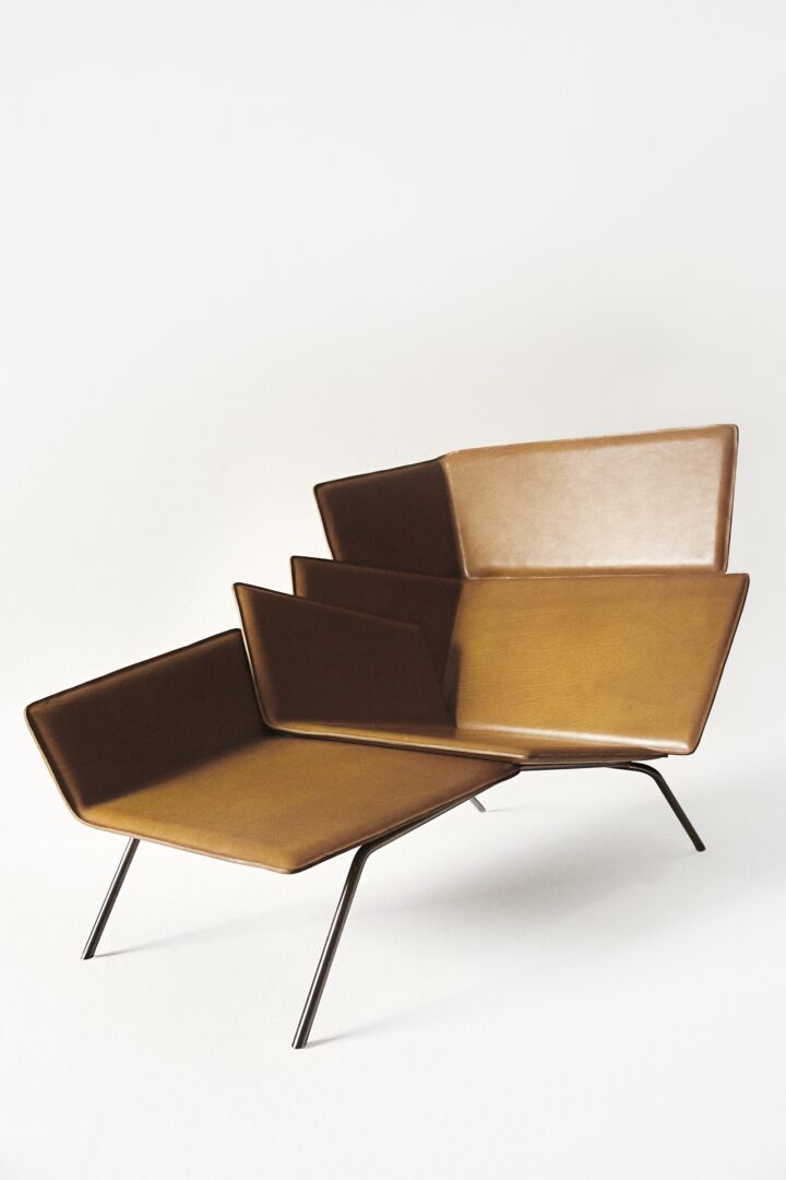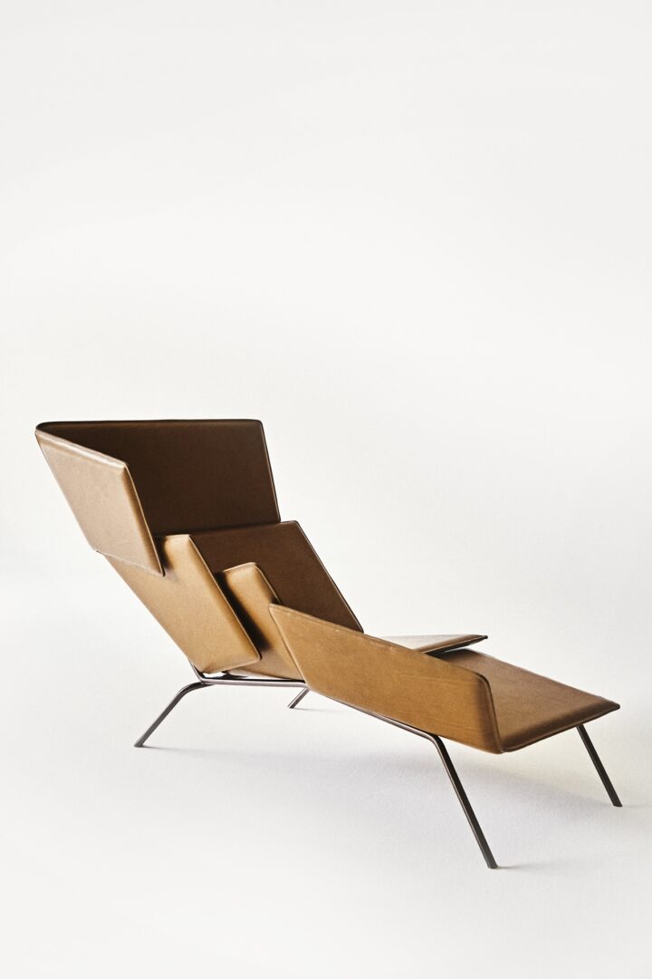 Шезлонг-скульптура с каркасом из мягких металлических лезвий и кожаной обивки на металлической основе.