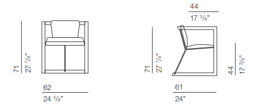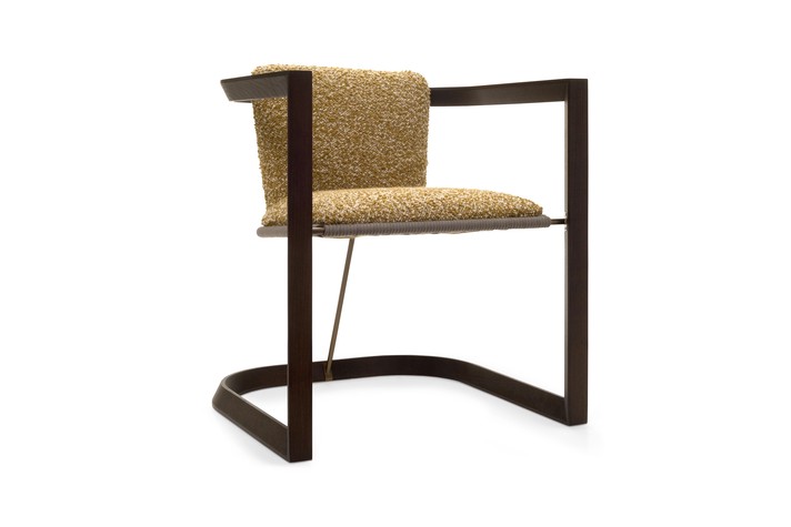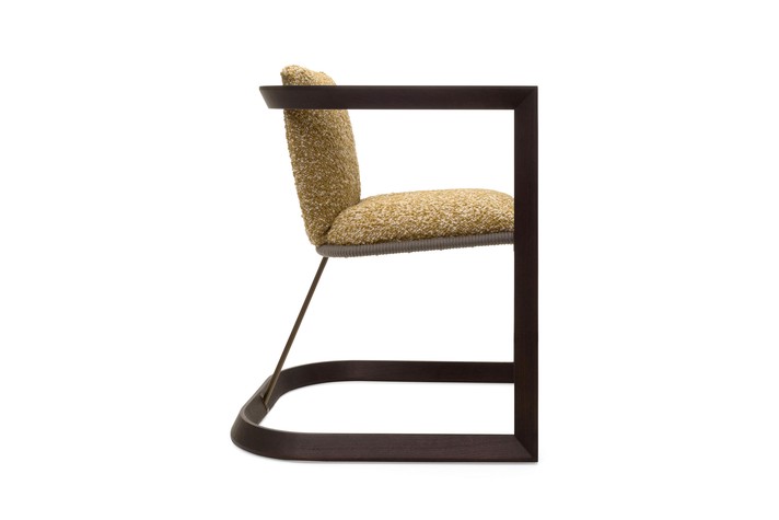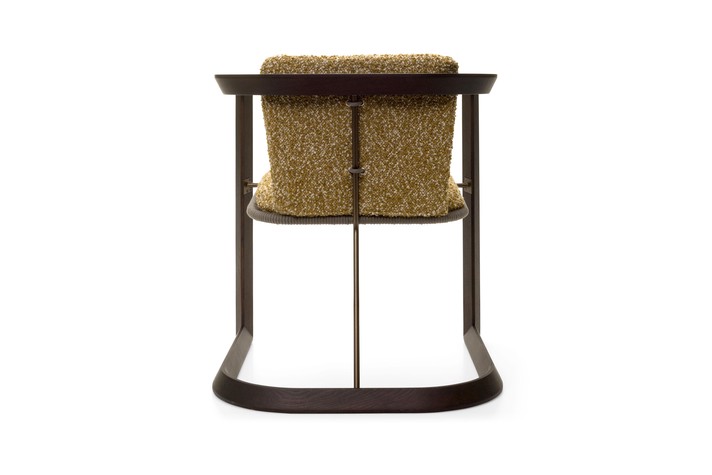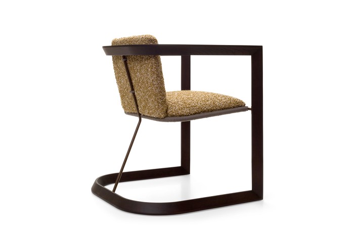 Эксклюзивное кресло в стиле минимализма с конструкцией из цельного дерева и стали, обволакивающими подлокотниками и тканевой или кожаной подушкой сиденья. Проект VGA Architects для Bodema.