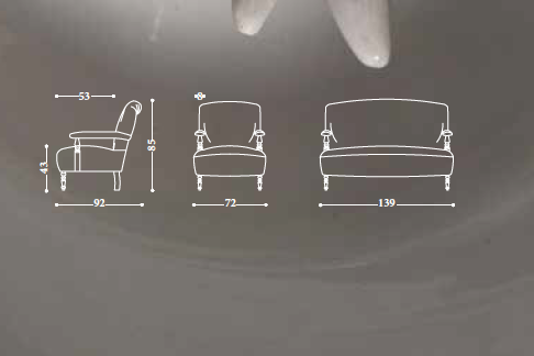 Версии: кресло и диван 2 места. Структура: дерево и его производные, высокопрочные перекрестные эластичные ремни. Обивка: пенополиуретан на высоте и дифференцированные качества, полиэфирные волокна. Характеристики: отделка деревянных ножек и опор подлокотников он доступен в цветах, предусмотренных в каталоге.