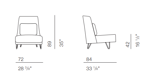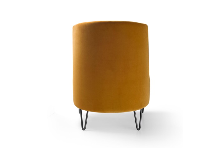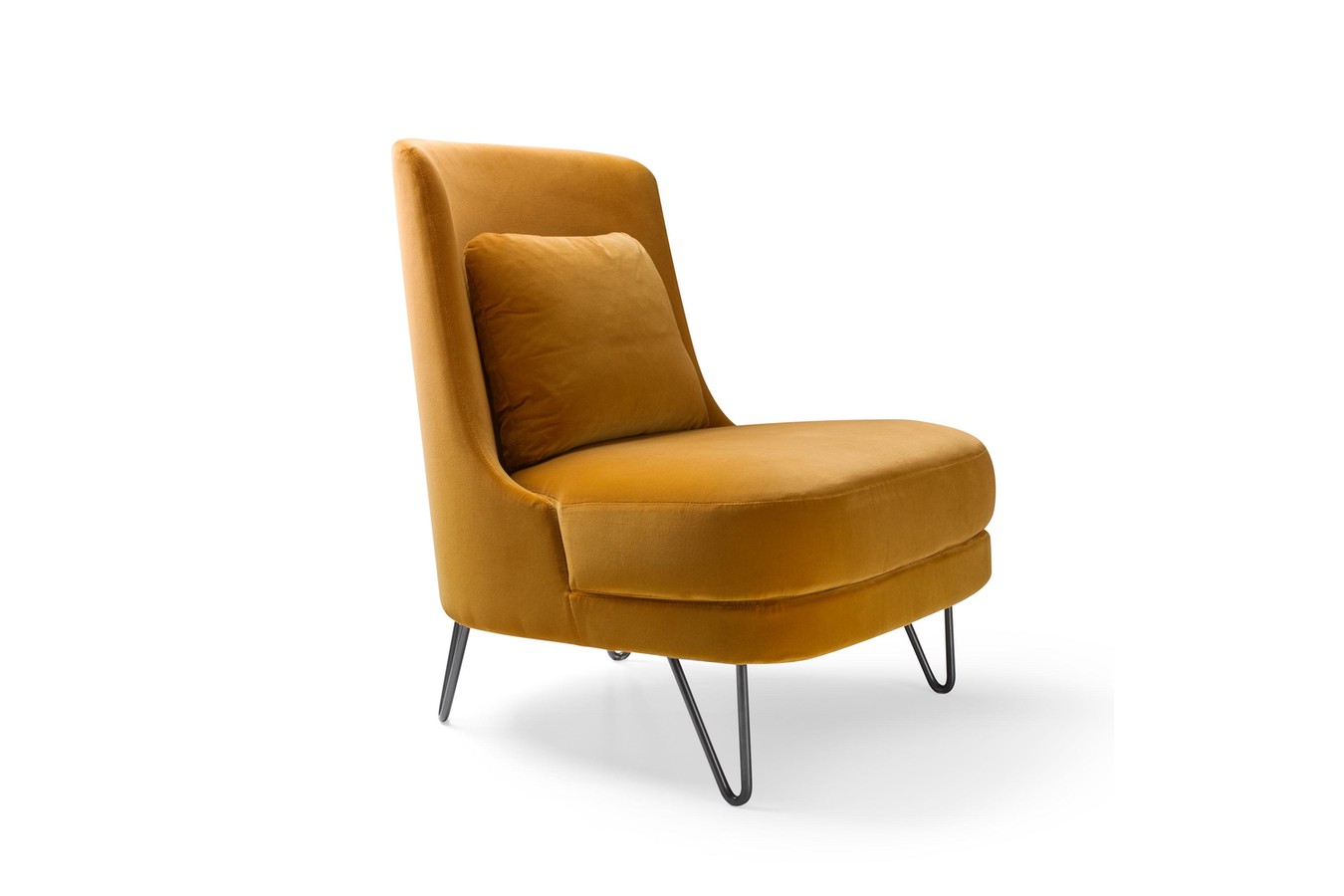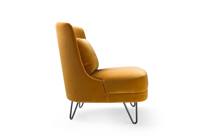 Кресло в стиле ретро с металлическими ножками-шпильками, вдохновленное культовыми предметами мебели середины века. Кресло без подлокотников, с набитой перьями подушкой для поясницы, обитое тканью, бархатом или кожей по индивидуальному заказу.