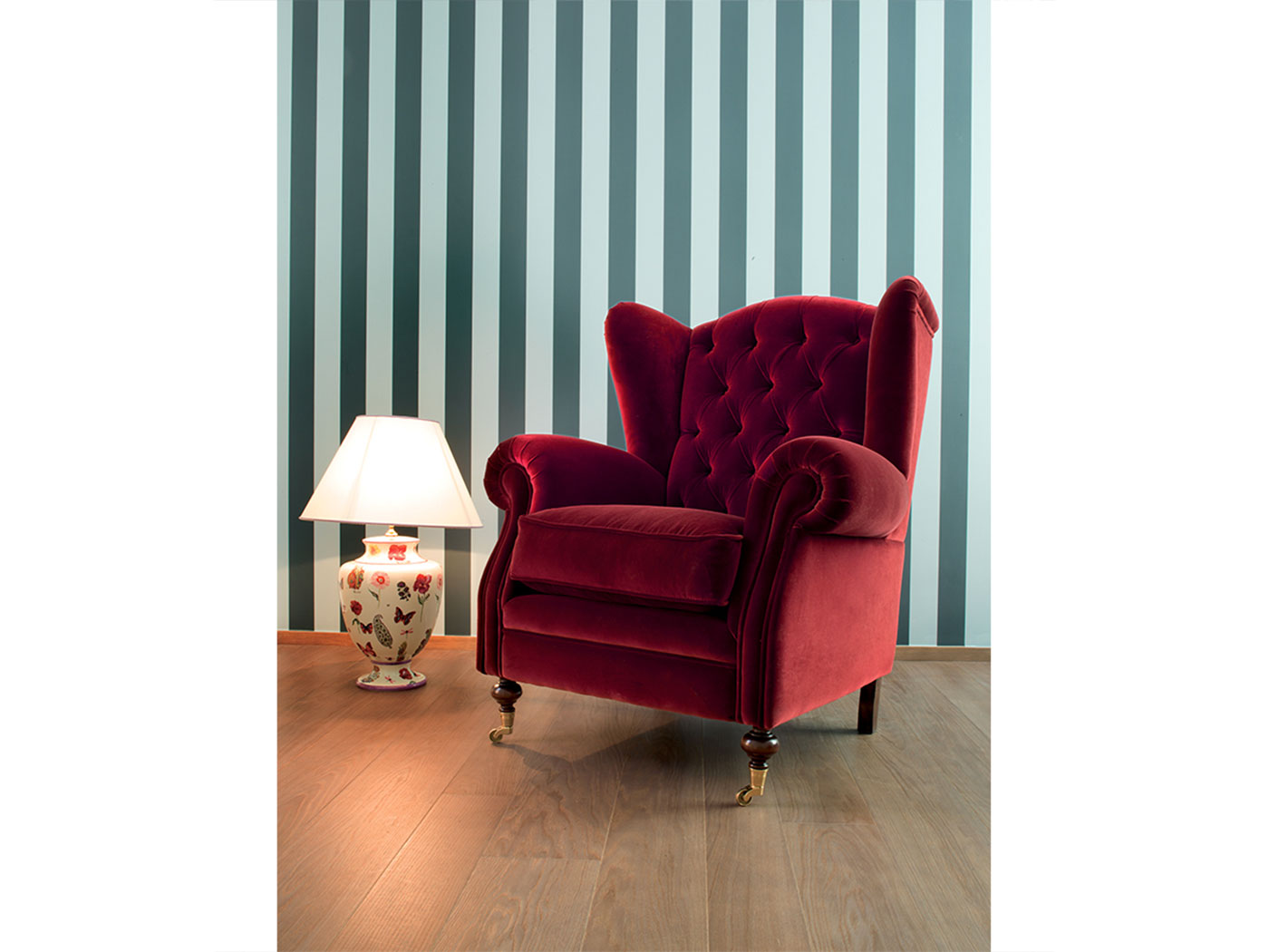 Версии: гладкое кресло, Кресло capitonnè и пуф. Структура: дерево и его производные, эластичные ремни скрещенные с высокой прочностью. Обивка: в