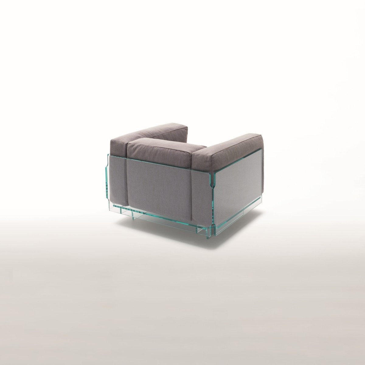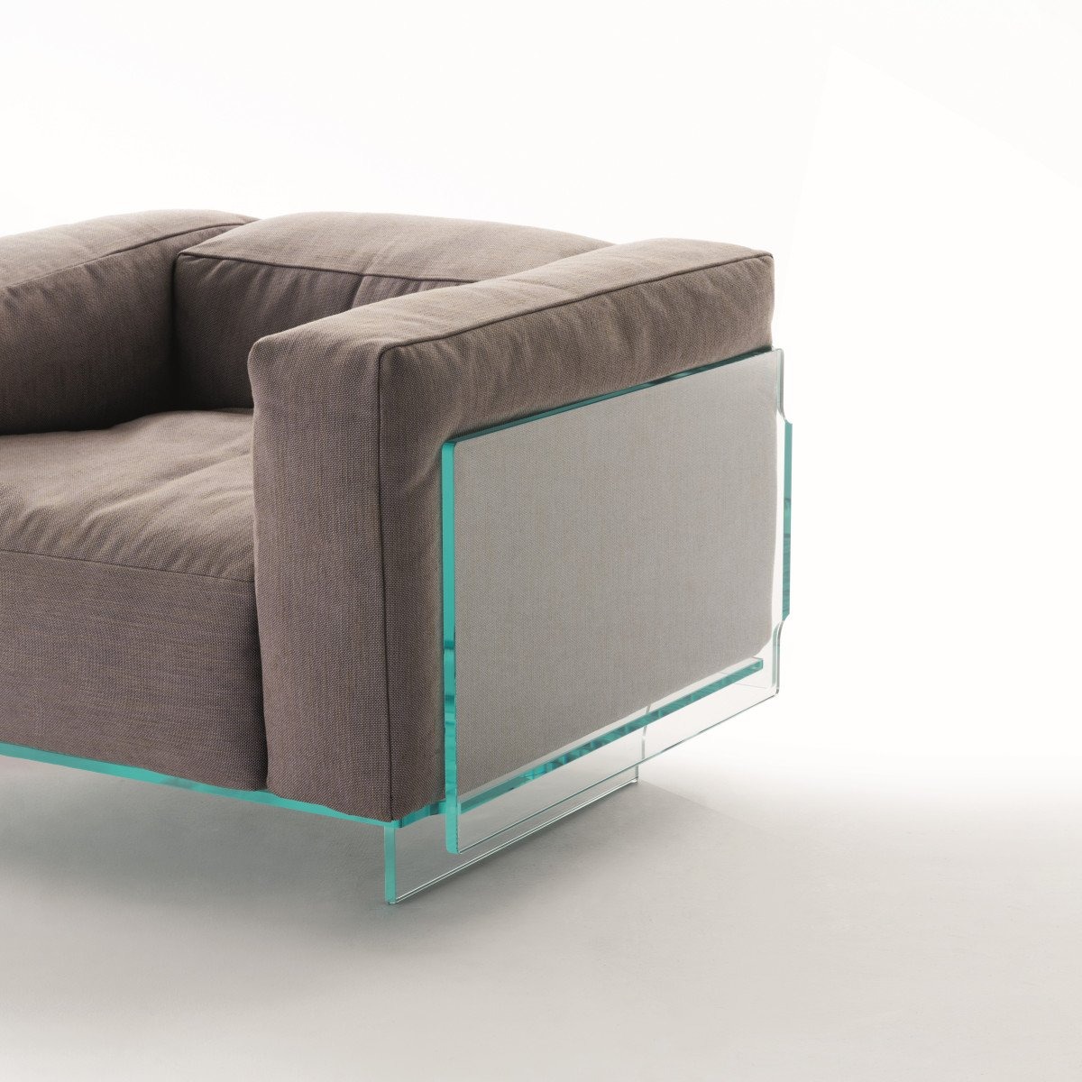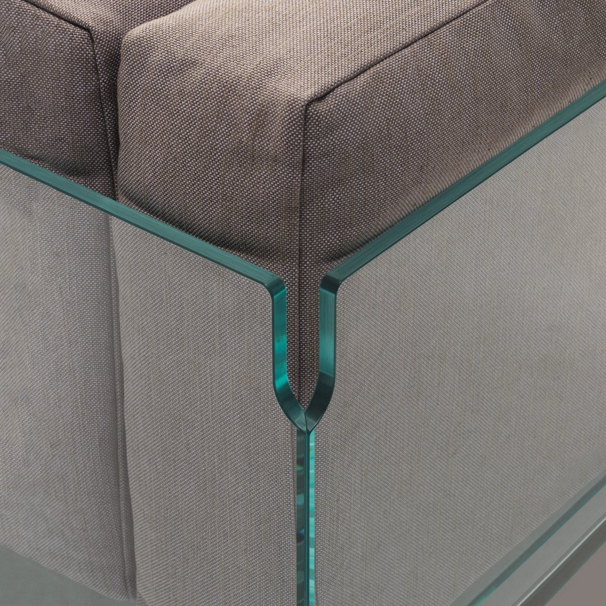 Зеркальный блок с хрустальным зеркалом, двумя столешницами и консольным столиком из грушевого дерева, а также коллекция секционных диванов и кресел из профилированного сверхпрочного стекла толщиной 15 мм, закаленного и проклеенного УФ-излучением. Стеклянная конструкция содержит мягкие подушки со съемными чехлами, выполненными из различных тканей и экокожи самых разных цветов. Наполнитель изготовлен из лавсана или нового мягкого материала, полученного из переработанного пластика, добытого в океанах, который не вызывает аллергии, не содержит вредных веществ и экологичен. Соединяя боковые модули (левый и правый) и центральный модуль, можно создавать множество различных конфигураций. Шпон Alpi. Основание выполнено из дерева, покрытого анилиновым лаком. Каждое изделие имеет прогрессивную нумерацию.